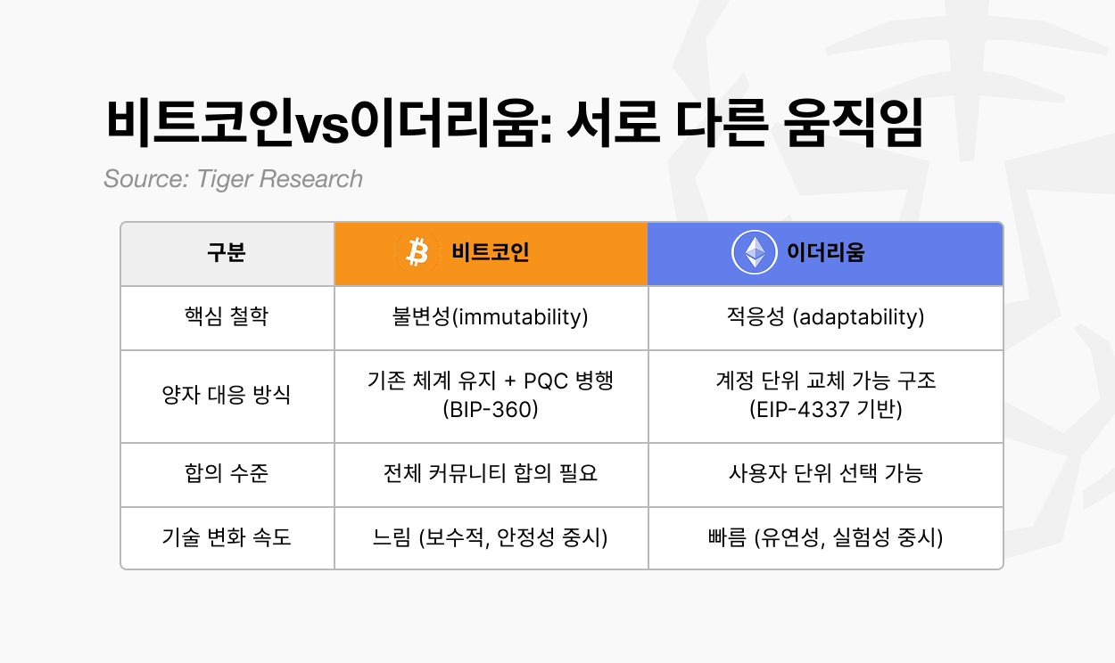 결국 비트코인이 기존 질서를 유지하며 PQC를 병행하는 방향이라면, 이더리움은 계정 구조를 재설계하여 PQC를 흡수하는 전략으로 나아가고 있다. 두 접근 모두 동일한 목표를 향하지만, 비트코인은 보존적 진화, 이더리움은 구조적 혁신이라는 서로 다른 방식으로 미래를 준비하고 있다.