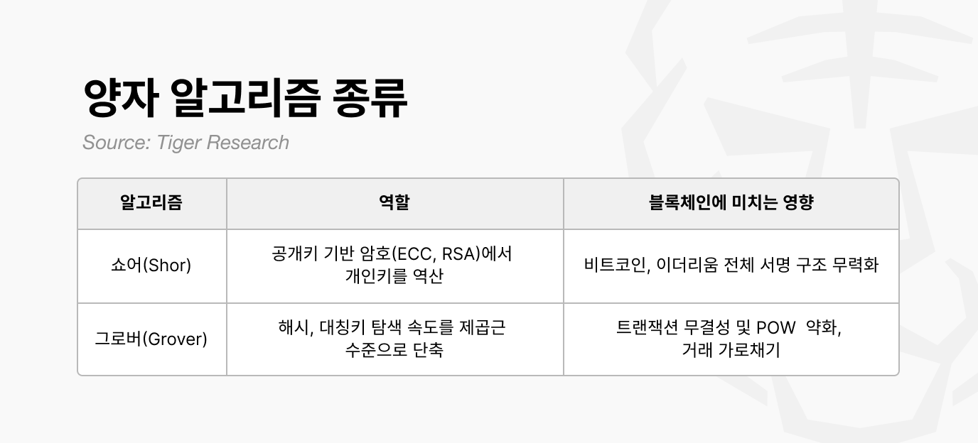 블록체인 보안에 직접적 위협이 되는 것은 두 가지 양자 알고리즘이다. 쇼어(Shor) 알고리즘은 공개키 기반 암호 문제를 공개키로부터 개인키를 역산할 수 있는 경로를 제공한다. 그로버(Grover) 알고리즘은 임의 검색 속도를 제곱근 수준으로 단축시켜 해시 함수의 실효 강도를 감소시킬 수 있다.