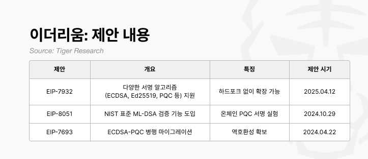 EIP-7932: 여러 서명 알고리즘을 네트워크 레벨에서 동시에 인식하고 검증할 수 있는 구조로, 사용자가 필요에 따라 알고리즘을 자유롭게 선택 가능