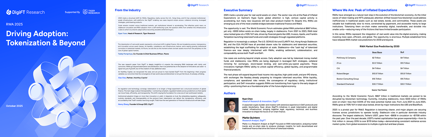 Laporan kolaborasi antara DigiFT dan Tiger Research ini membedah seluruh lapisan ekosistem Real-World Assets (RWA): siapa yang membangunnya, siapa yang menggunakannya, dan bagaimana saham serta obligasi yang ditokenisasi mulai menggeser sistem keuangan lama.