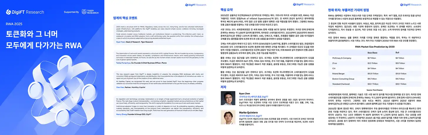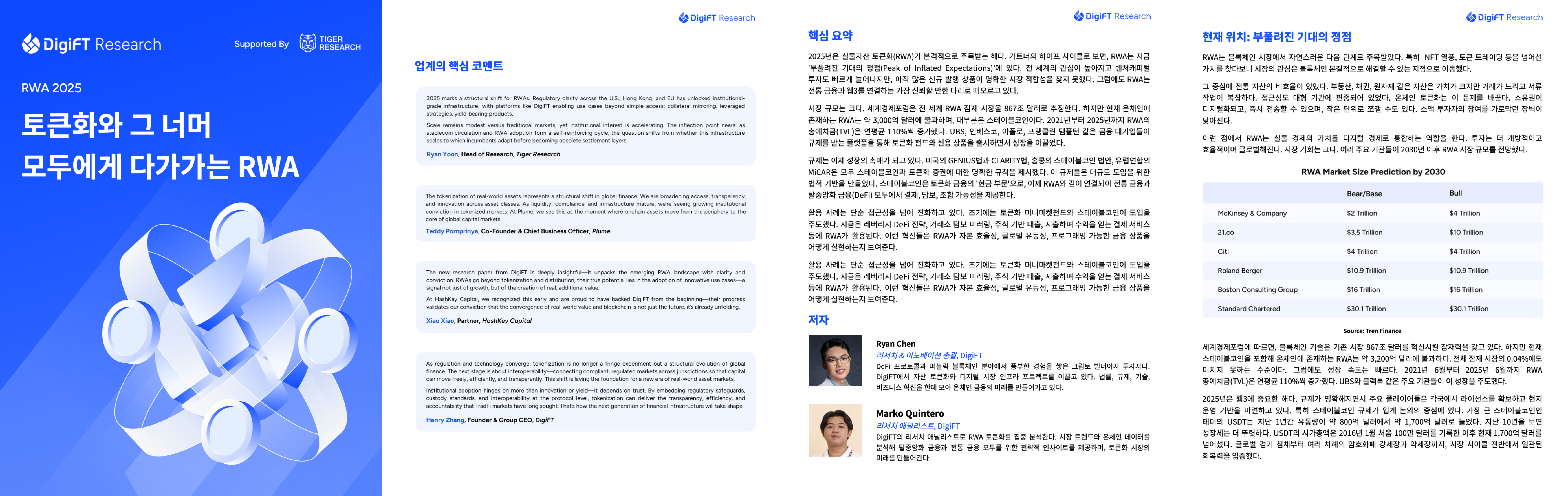 이번 DigiFT와 Tiger Research의 공동 보고서는 RWA 시장의 전반을 해부한다. 누가 이 시장을 만들고, 누가 활용하며, 어떻게 토큰화된 주식과 채권이 기존 금융을 잠식해 가는지를 다룬다.