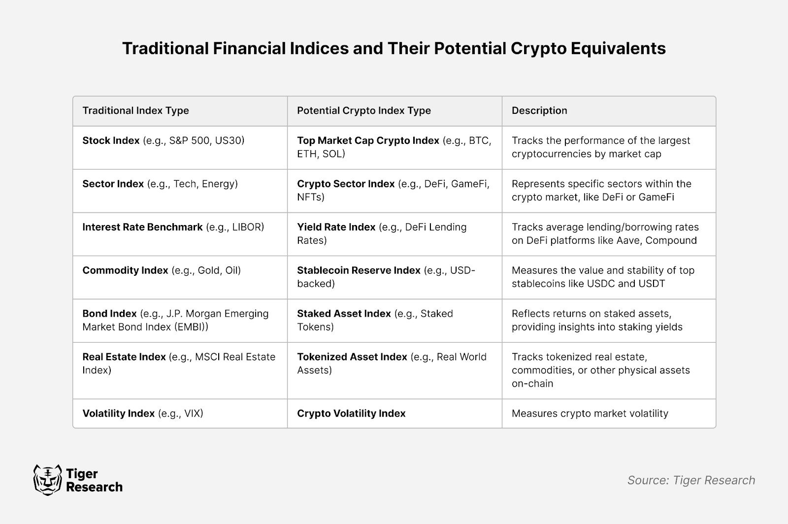 Traditional financial markets have long relied on benchmarks like the S&P 500 and Dow Jones to provide consistency and trust for pricing, performance tracking, and portfolio management. Commodity markets similarly use indices to stabilize pricing for goods like crude oil and gold. Crypto indices can adopt this proven model, offering institutional investors a trusted framework for asset allocation, performance measurement, and portfolio rebalancing.