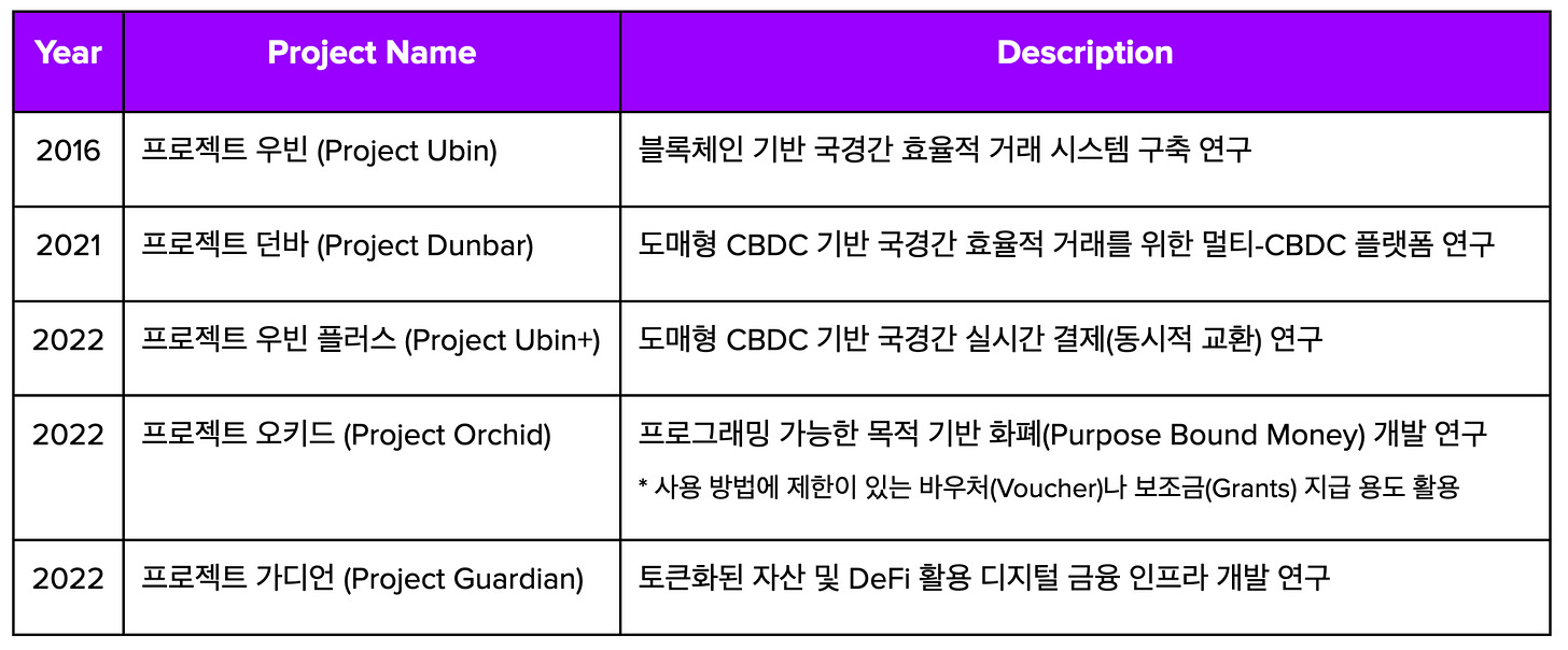 두 번째로 프로젝트가 단순 연구를 넘어서 파일럿(Pilot) 프로젝트나 상용 서비스로 발전하여 실증적 검증이 이루어지고 있다는 것이다. 실제로 프로젝트 오키드는 아마존닷컴, 그랩 등과 함께 목적 기반 화페 활용 파일럿 테스트를 운영하며 실증적 검증을 이루었다. 또한, 프로젝트 우빈에서는 블록체인 기반 국경간 결제 플랫폼 ‘파티오르(Partior)’가 개발되어 실제 운영 환경에서 사용되고 있다.