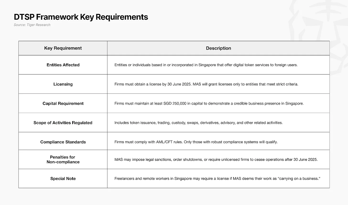 Laporan ini disusun oleh Tiger Research dan menganalisis dampak perubahan regulasi DTSP terhadap industri Web3 di Singapura.
