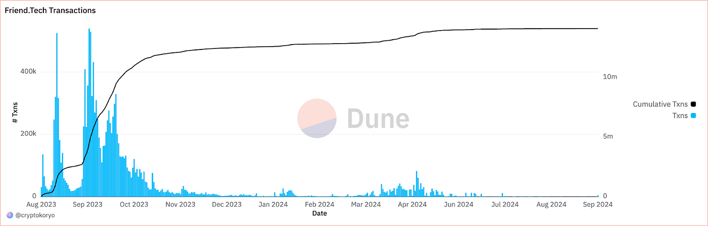 Friend.tech과 같은 플랫폼은 이러한 한계를 잘 보여준다. 초기의 투자 열풍에 크게 의존하며, 이후 지속적인 업데이트나 새로운 콘텐츠, 특별한 사용자 경험을 제공하지 못하면서 사용자가 급감했다. 결국 일일 활성 사용자 수가 크게 줄고 플랫폼의 영향력도 떨어졌다.