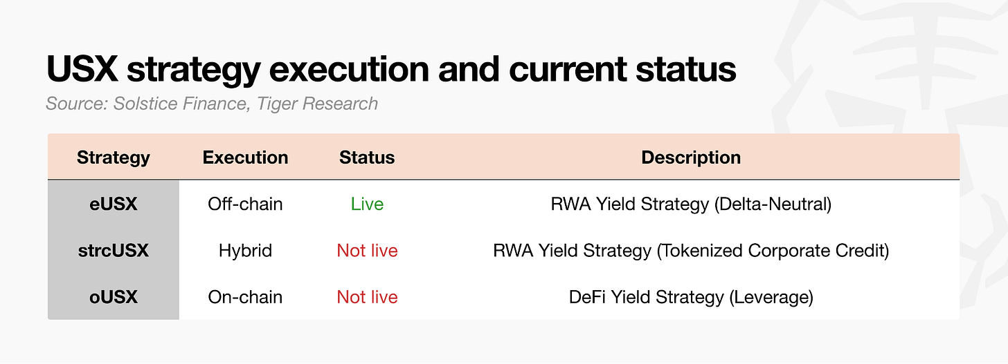 All Three strategies share one commonality: they run on USX. The difference lies in how yield is generated and the level of risk involved. eUSX is currently live; the remaining two strategies are in pre-launch.