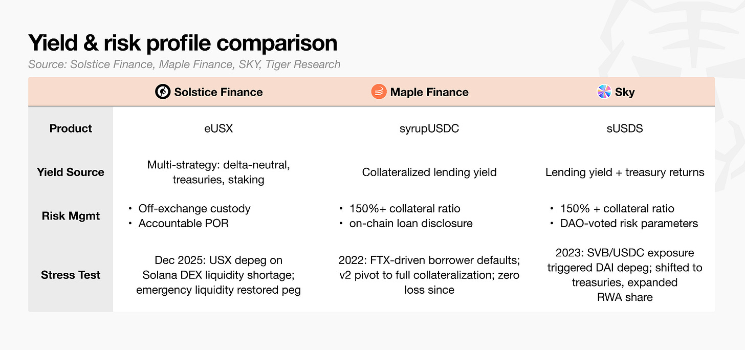 This is what the user sees. However, eUSX’s yield structure is not fully verifiable on-chain in real time. To address this, Solstice partners with Accountable to provide external verification of collateralization ratios and solvency. Even so, the custodial framework and exchange risk management remain critical variables.