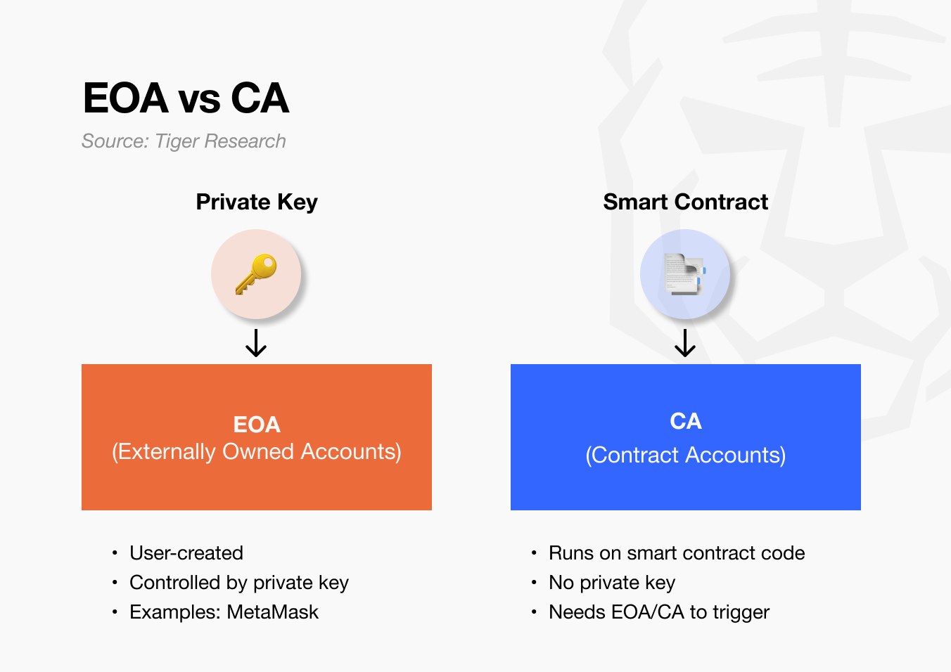 Contract Accounts (CA): smart contracts capable of executing complex logic but unable to initiate transactions independently.