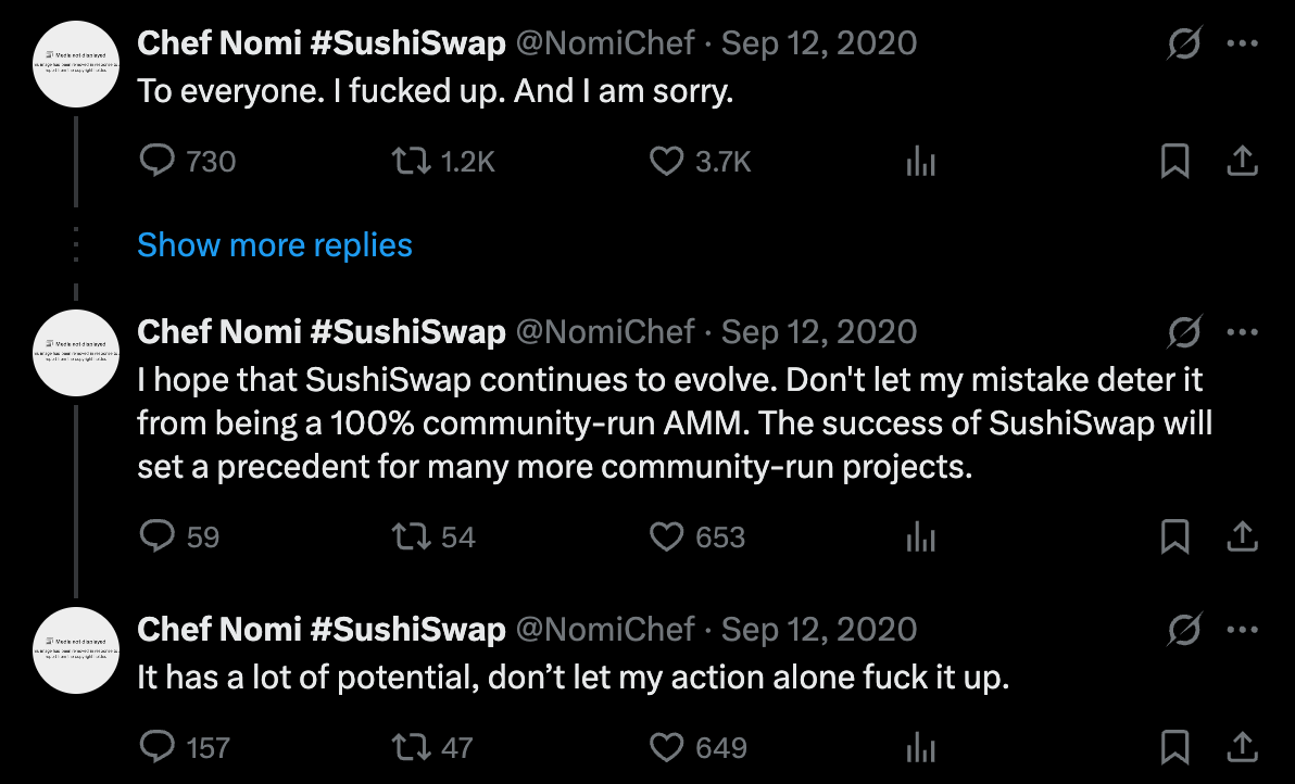 스시스왑(SushiSwap)이 이러한 구조적 한계를 보여주는 대표적인 사례다. 창립자 쉐프 노미(Chef Nomi)가 프로젝트에서 갑작스럽게 물러나며 재무 자금을 인출하자, 커뮤니티는 즉각 혼란에 빠졌다. 겉으로는 탈중앙화된 구조를 갖추고 있었지만, 실제 운영 권한은 창업자에게 집중돼 있었다. 빠른 대응이 불가능했다.