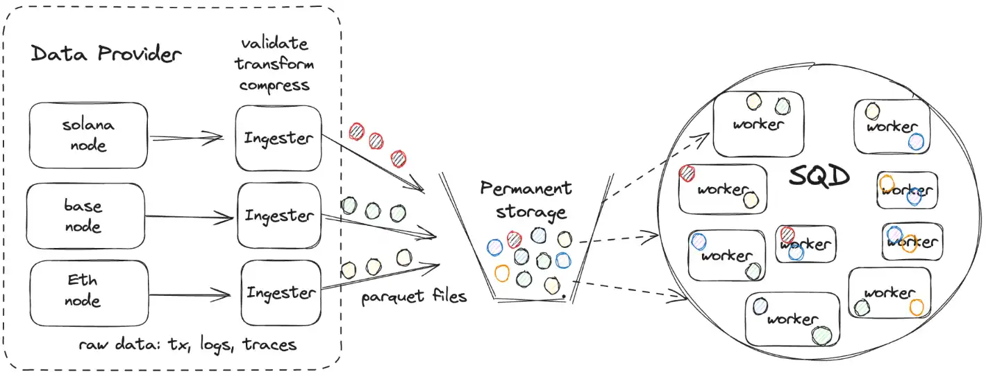 Data Providers are currently managed by the SQD team during the initial bootstrap phase. This strategy ensures initial data quality and stability. As the network matures, external providers will be able to participate through token governance. This will fully decentralize the data sourcing stage.