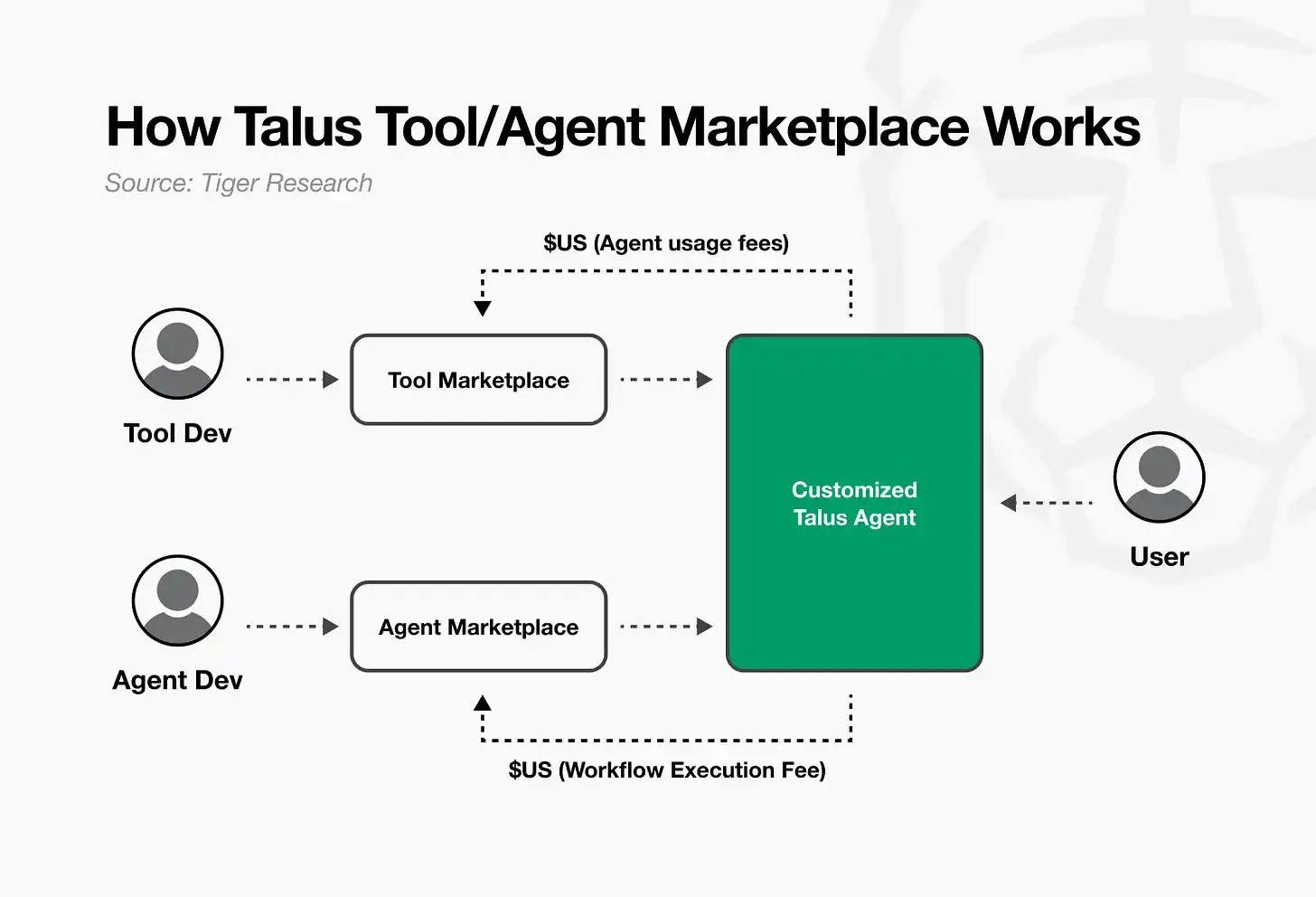 Talus 的 Nexus 开发框架本身就形成了一个市场。正如 Figma 等服务通过第三方插件生态系统形成开发者市场一样,Talus 也构建了以工具和代理为中心的市场。这种结构使开发者能够直接贡献并产生收入。