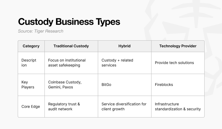 Custody providers can be broadly categorized into three models: traditional custodians focus on regulatory trust and compliance, hybrid models pursue service diversification, and technology providers compete through security and API-based infrastructure. Across jurisdictions, Singapore, Hong Kong, Japan, and South Korea have each developed distinct local custody frameworks.