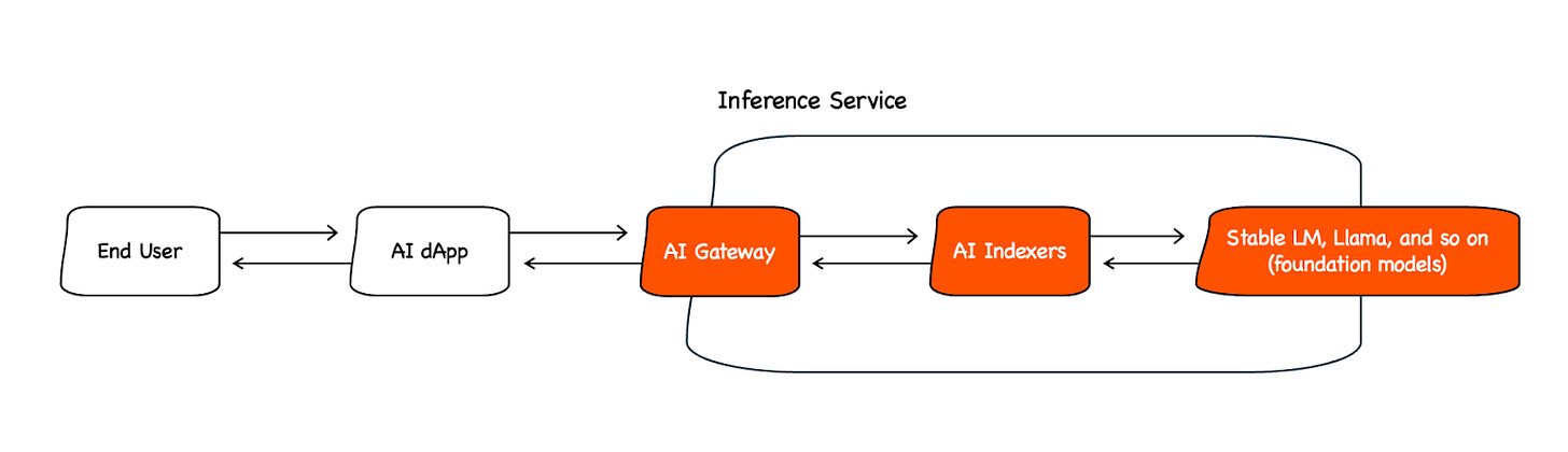 첫 번째는 '추론(Inference) 서비스'이다. 이 서비스는 주로 AI 모델의 실행과 결과 도출에 초점을 맞추고 있다. 특히 흥미로운 점은, 그래프가 블록체인 데이터를 분산 환경에서 효율적으로 인덱싱하는 것처럼, AI 모델의 배포와 실행 과정에서도 분산된 인덱서의 컴퓨팅 파워를 활용하도록 지원한다는 것이다. 이러한 탈중앙화 방식의 운영은 매우 중요한데, 최근 AI 산업이 소수의 대형 LLM에 의해 중앙화된 방식으로 운영됨에 따라 그 필요성이 더욱 커지고 있다.