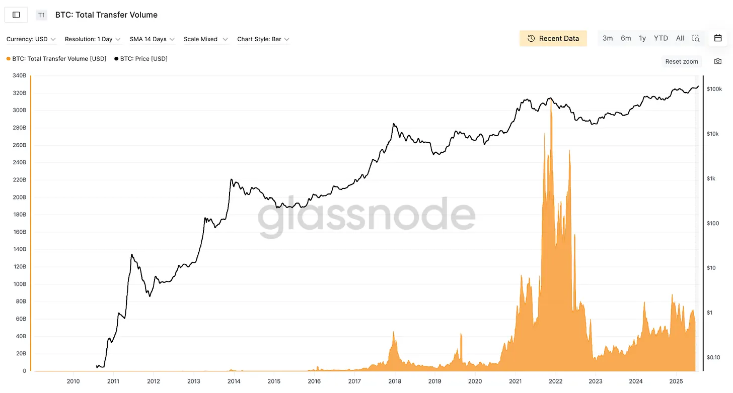 Transfer volume melampaui sekadar frekuensi transaksi untuk menunjukkan seberapa besar Bitcoin digunakan dalam aktivitas ekonomi yang penting. Indikator ini mengukur skala ekonomi riil yang tidak dapat ditangkap hanya dengan transaction count.