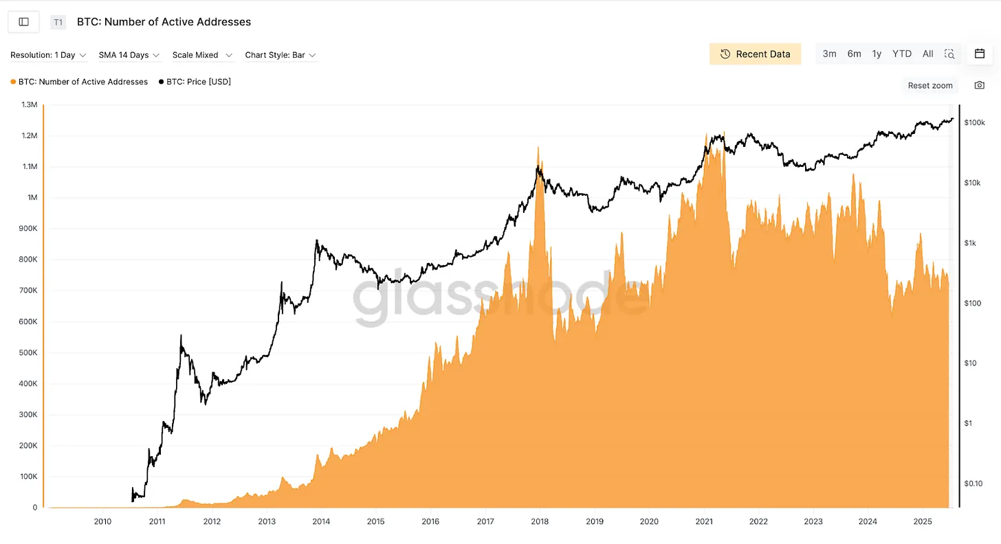 Oleh karena itu, kami mendefinisikan nilai riil Bitcoin sebagai fungsi dari jaringan tersentralisasi-nya sistem yang tidak dikendalikan oleh otoritas pusat mana pun. Nilai jaringan ini berasal dari partisipasi dan aktivitas pengguna, mirip dengan Hukum Metcalfe: semakin tinggi keterlibatan pengguna, semakin besar kegunaan jaringan dan nilai jangka panjangnya. Sebaliknya, penurunan aktivitas dapat mengurangi nilai yang dirasakan. Baru-baru ini, ekosistem BTCFi telah muncul dan memperluas kasus penggunaan Bitcoin, yang membuat analisis aktivitas jaringan menjadi semakin penting.