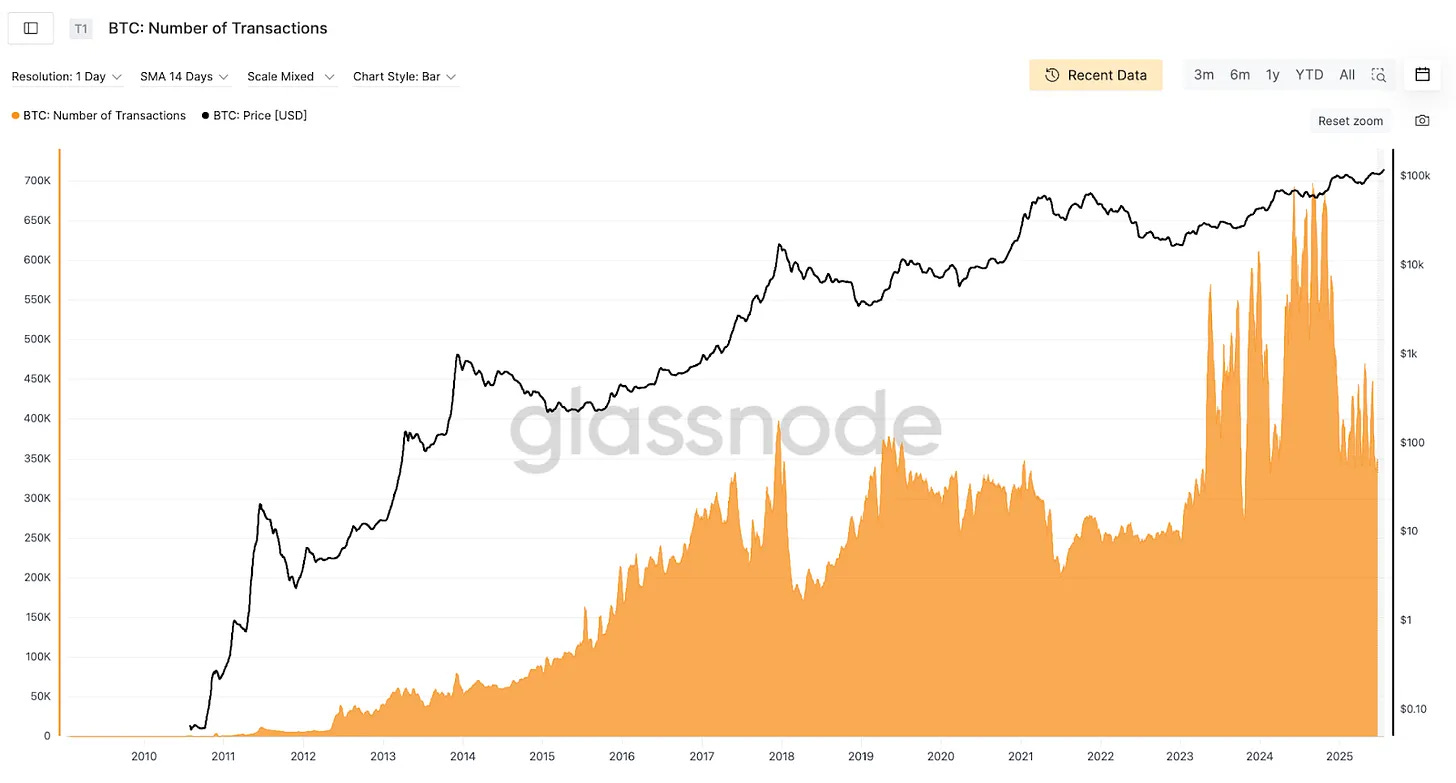 Transaction count adalah cara paling langsung untuk mengukur seberapa sering orang menggunakan jaringan Bitcoin. Ibarat lalu lintas harian di sebuah kota—ini menunjukkan seberapa sering orang benar-benar berinteraksi dengan jaringan.