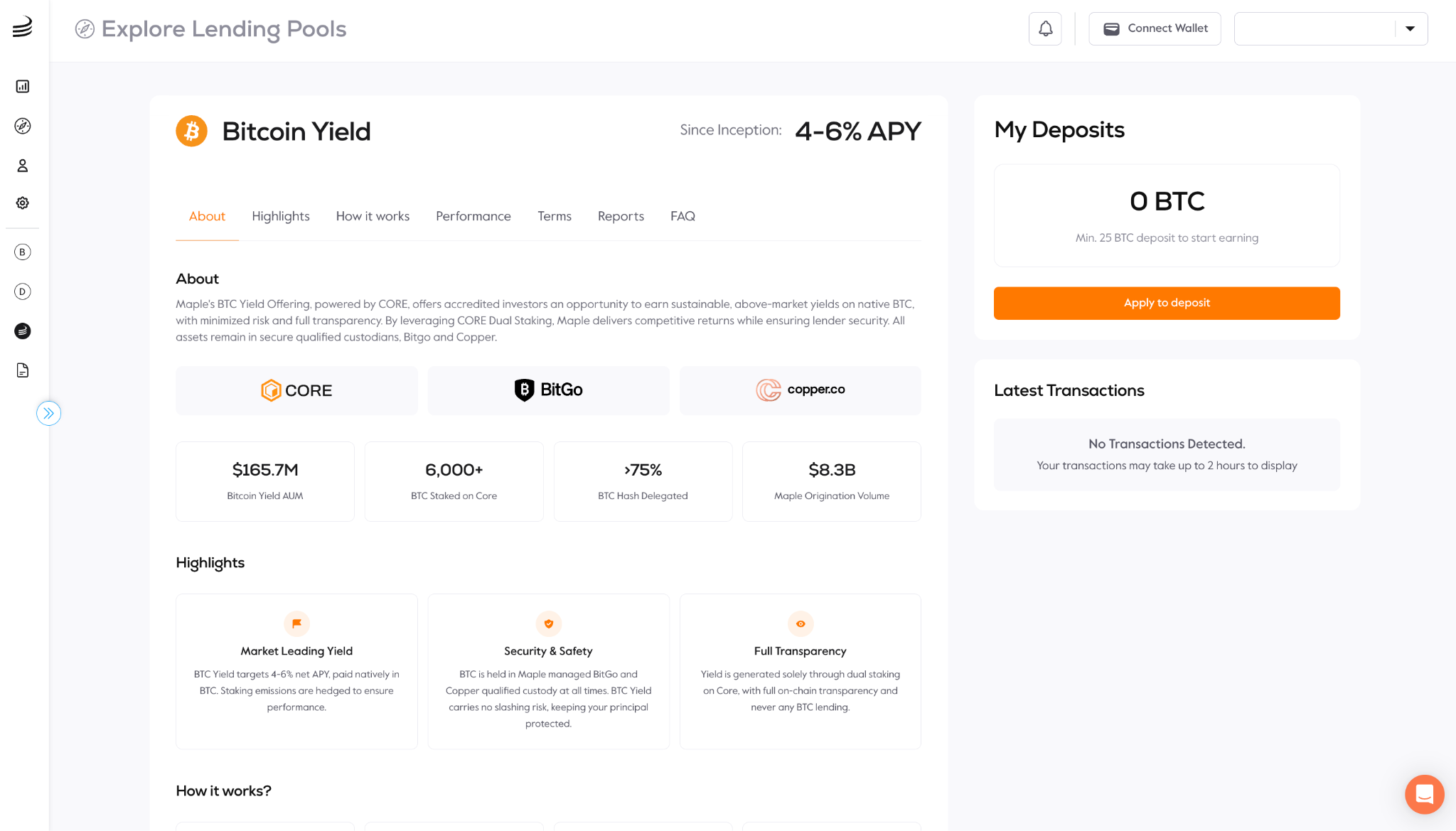 In 2025, Maple expanded this model to Bitcoin. Through a partnership with the Bitcoin Layer 2 network Core DAO, it introduced yield-generating BTC products that allow institutions to earn returns while holding Bitcoin.