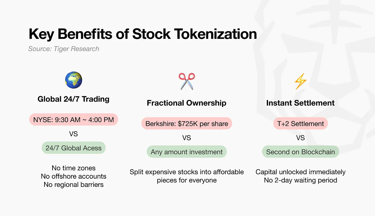 Berbeda dari kategori RWA lain yang masih harus menciptakan permintaan, saham tertokenisasi langsung membangun di atas pasar ekuitas global senilai $134 triliun. Argumentasi untuk tokenisasi diperkuat oleh manfaat konkret seperti biaya lebih rendah, akses lebih luas, perdagangan 24/7, dan integrasi DeFi. Seiring berkembangnya kerangka regulasi, saham tertokenisasi semakin siap untuk adopsi berskala besar.