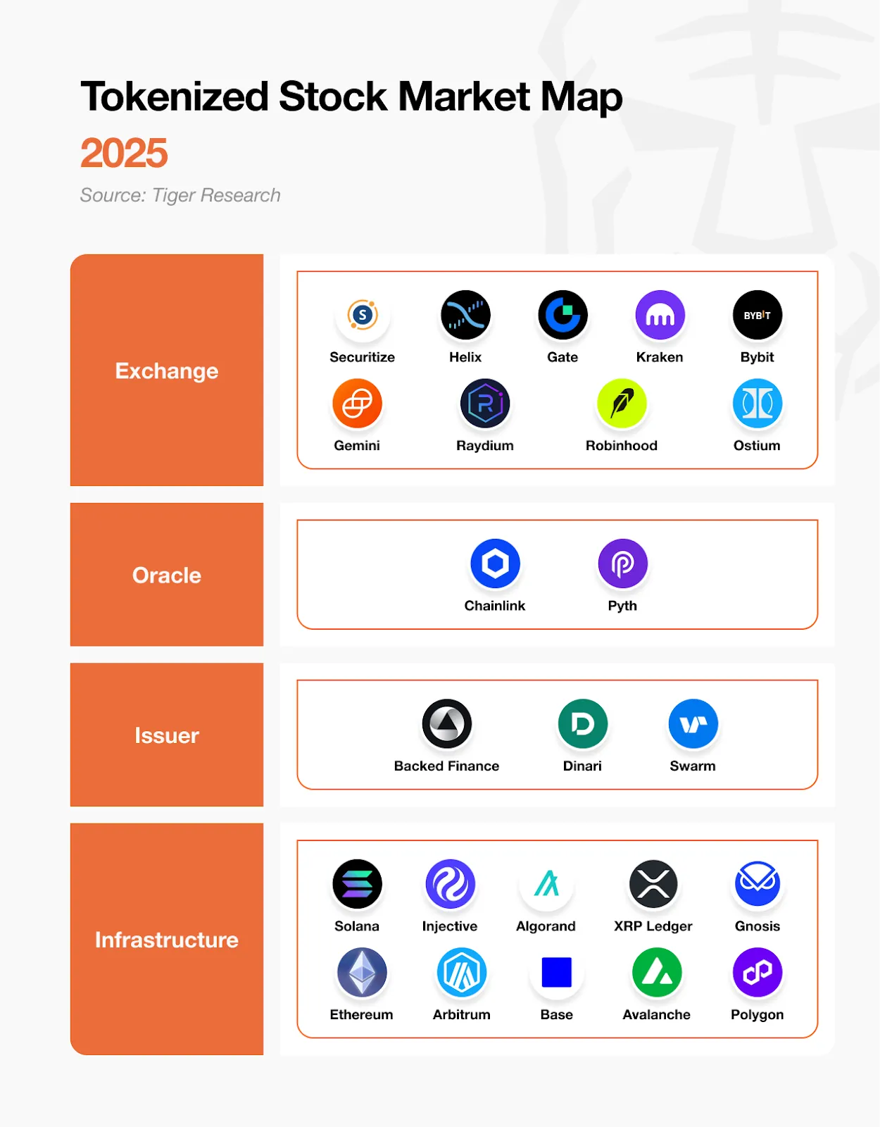 Di lapisan dasar terdapat lapisan infrastruktur, yang menyediakan jaringan blockchain tempat seluruh transaksi berlangsung. Di atasnya terdapat penerbit (issuers) yang bertanggung jawab menciptakan representasi tokenisasi dari saham tradisional. Untuk memastikan pelacakan harga yang akurat, oracle menyediakan data pasar secara real-time dan mempertahankan keterhubungan dengan aset yang mendasarinya. Terakhir, bursa (exchanges) memungkinkan investor untuk membeli dan menjual saham yang telah ditokenisasi.