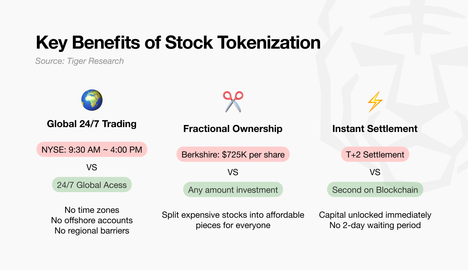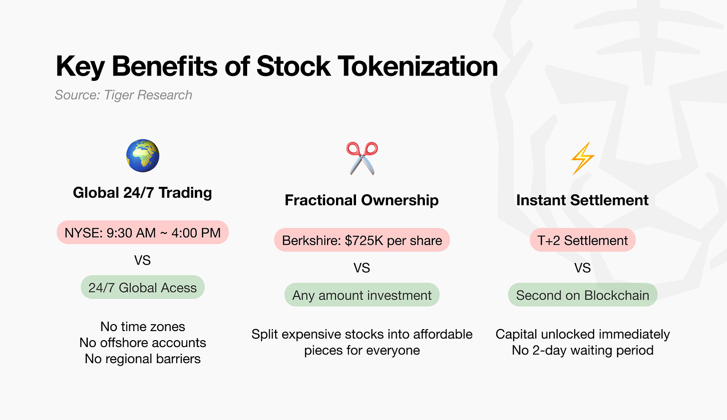 이 시장의 본질적 강점은 명확하다. 기존 주식 시장에서 이미 거래되고 있어 수요에 대해서는 충분히 증명된 자산 영역이다. 동시에 거래 부분에서 분명한 불편함이 존재했던 영역이기도 하다. 이는 토큰화 시장에서 가장 이상적인 조건이다. 증명된 수요와 개선될 수 있는 영역이 분명한 시장이기 때문이다.