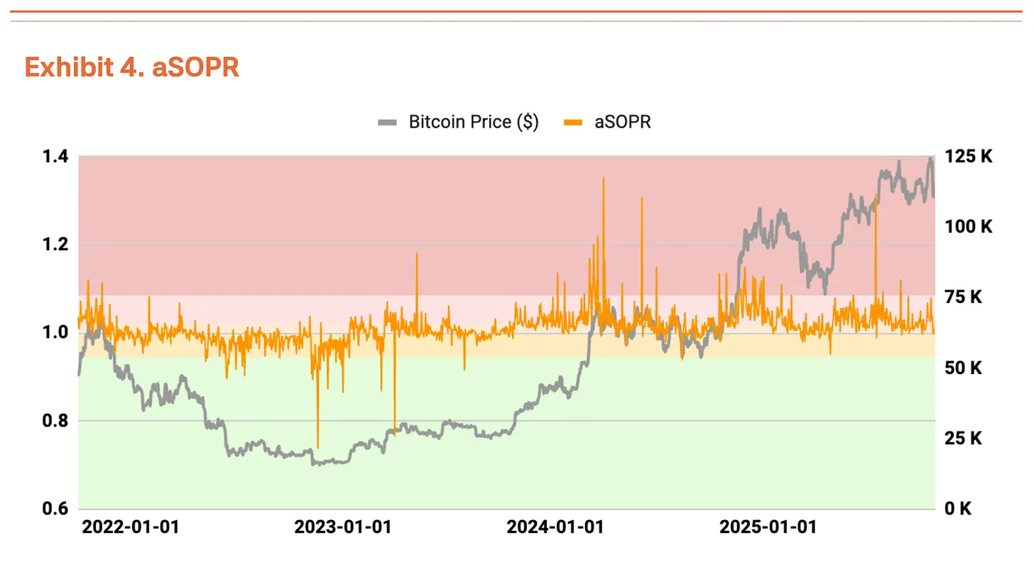净未实现盈亏比 (NUPL) 也显示出过热区域,但较第二季度的高未实现利润状况已有所缓和(图表3)。调整后的支出产出利润率 (aSOPR) 反映了投资者的已实现盈亏,该比率非常接近均衡值1.03,表明无需担忧(图表4)。
