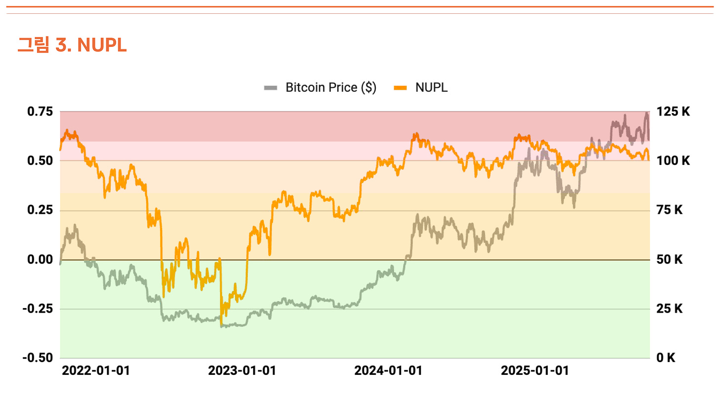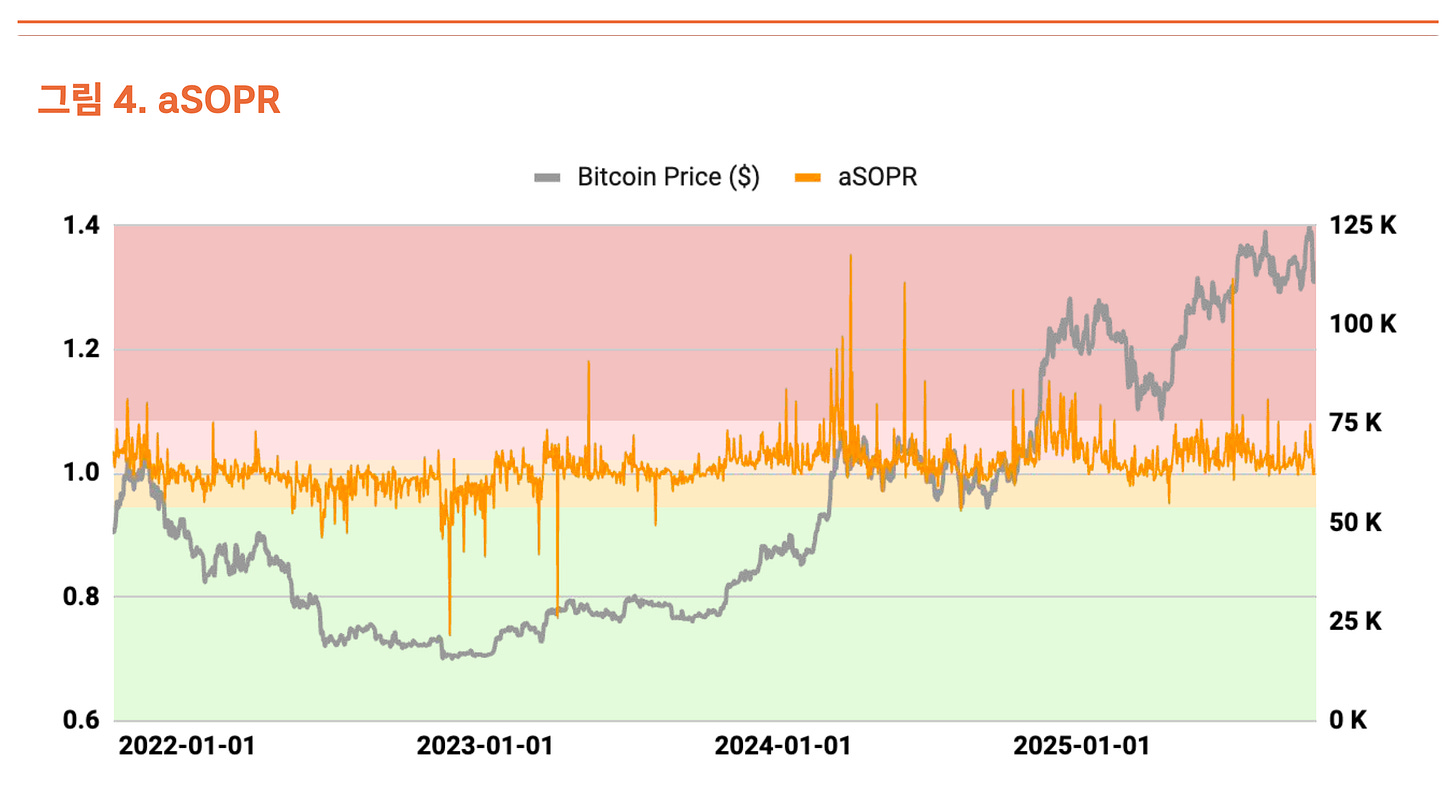 NUPL(순미실현손익 비율)도 과열 조짐 구간에 있지만, 지난 2분기의 높은 미실현 수익 상황보다는 완화된 모습이다(그림 3). 투자자들의 실현 손익을 나타내는 aSOPR(조정된 지출산출수익률)은 1.03으로 균형 구간에 매우 근접해 있어 우려할 수준은 아니다(그림 4).