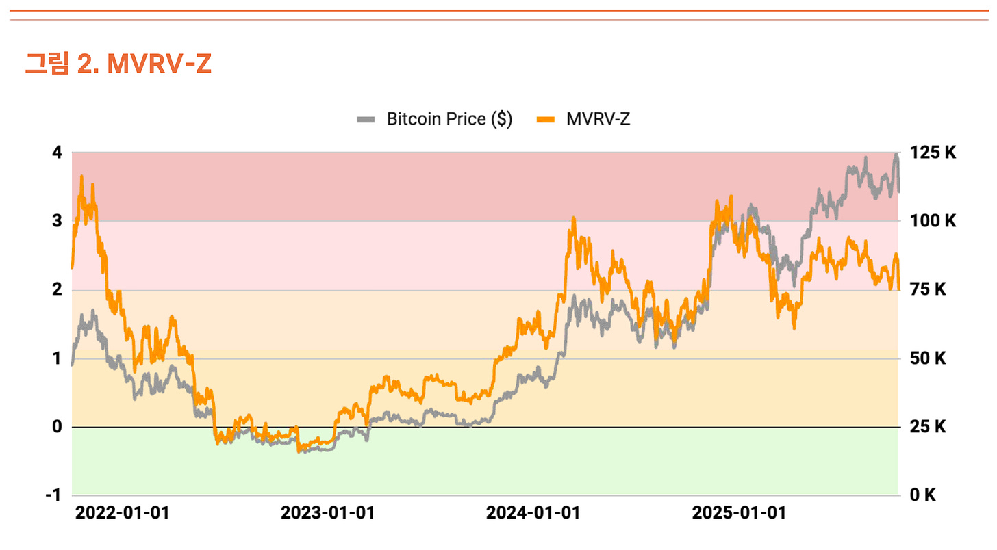 온체인 지표 분석 결과, 현재 다소 과열된 조짐이 관찰되지만 우려할 수준의 고평가 구간은 아니다. MVRV-Z 지표(시장가치 대비 실현가치 비율)는 2.31로 과열 구간에 있으나, 극심한 고평가 구간에 근접했던 7-8월에 비해 안정화된 상태다(그림 2).