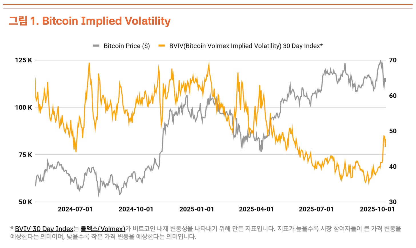 2025년 3분기 비트코인 시장은 2분기의 강력한 상승 모멘텀(+28% QoQ)이 둔화되며 변동성 확대 속 횡보 국면을 나타냈다(+1% QoQ). 10월 6일 $126,210의 역대 최고가를 경신했으나, 트럼프 행정부의 대중 무역 압박 재점화로 $104,000까지 18% 조정받으며 강한 변동성을 보였다. Volmex Finance의 비트코인 변동성 지수 BVIV에 따르면, 3월부터 9월까지 기관투자자들의 지속적인 매집으로 변동성이 축소되는 양상을 보였으나, 9월 이후 41% 급등하며 시장 불확실성이 증폭되었다(그림 1).