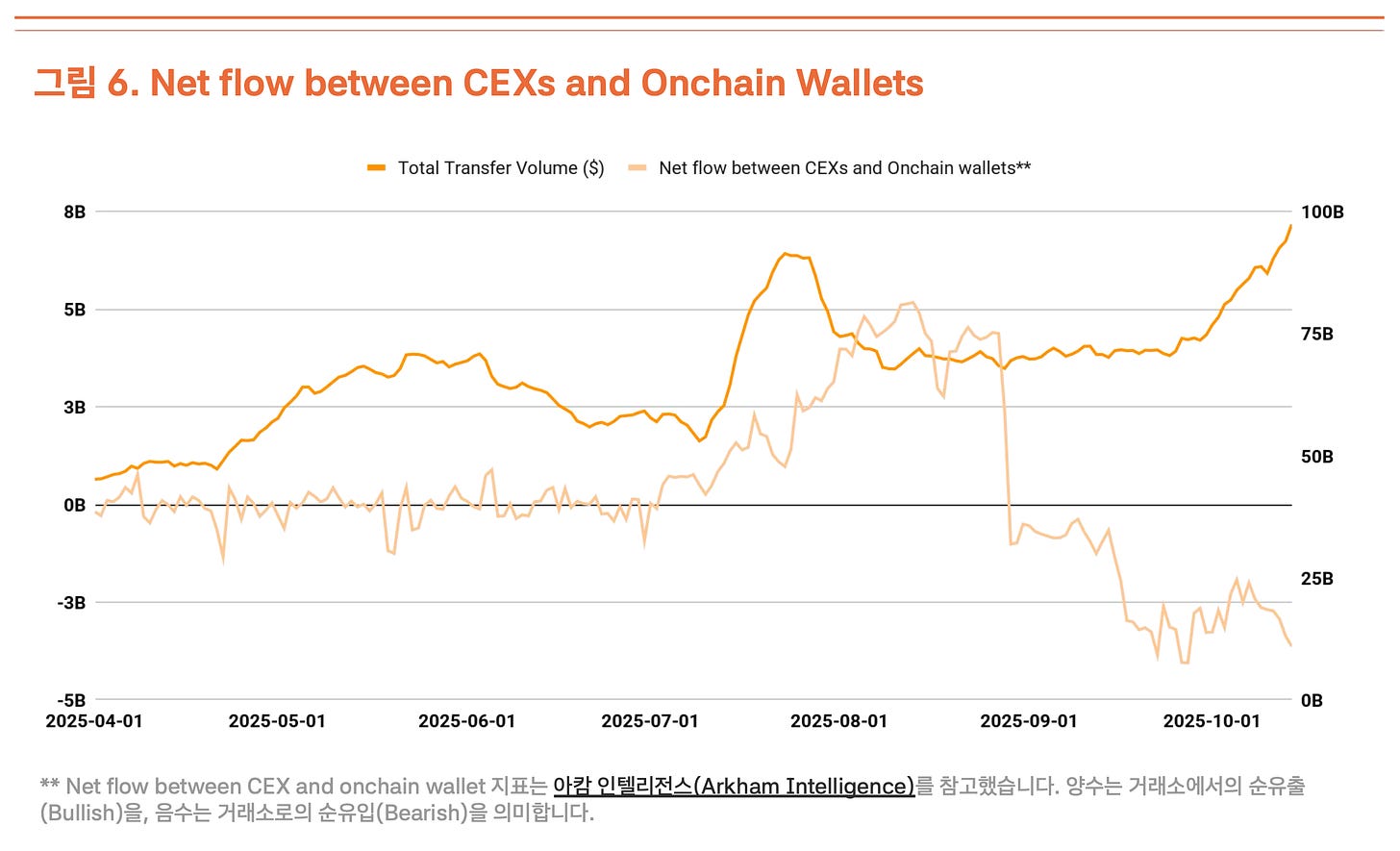 그러나 이러한 거래 규모의 확대를 긍정적으로만 해석하기는 어렵다. 최근 중앙화거래소로 유입되는 자금이 증가하고 있으며, 이는 일반적으로 보유자들이 매도를 준비하는 신호로 받아들여진다(그림 6). 펀더멘털 지표(거래 건수, 활성 사용자)의 개선 없이 거래 규모만 증가한 것은 실수요 확대보다는 높은 변동성 속 단기 자금 이동과 매도 압력으로 해석된다.