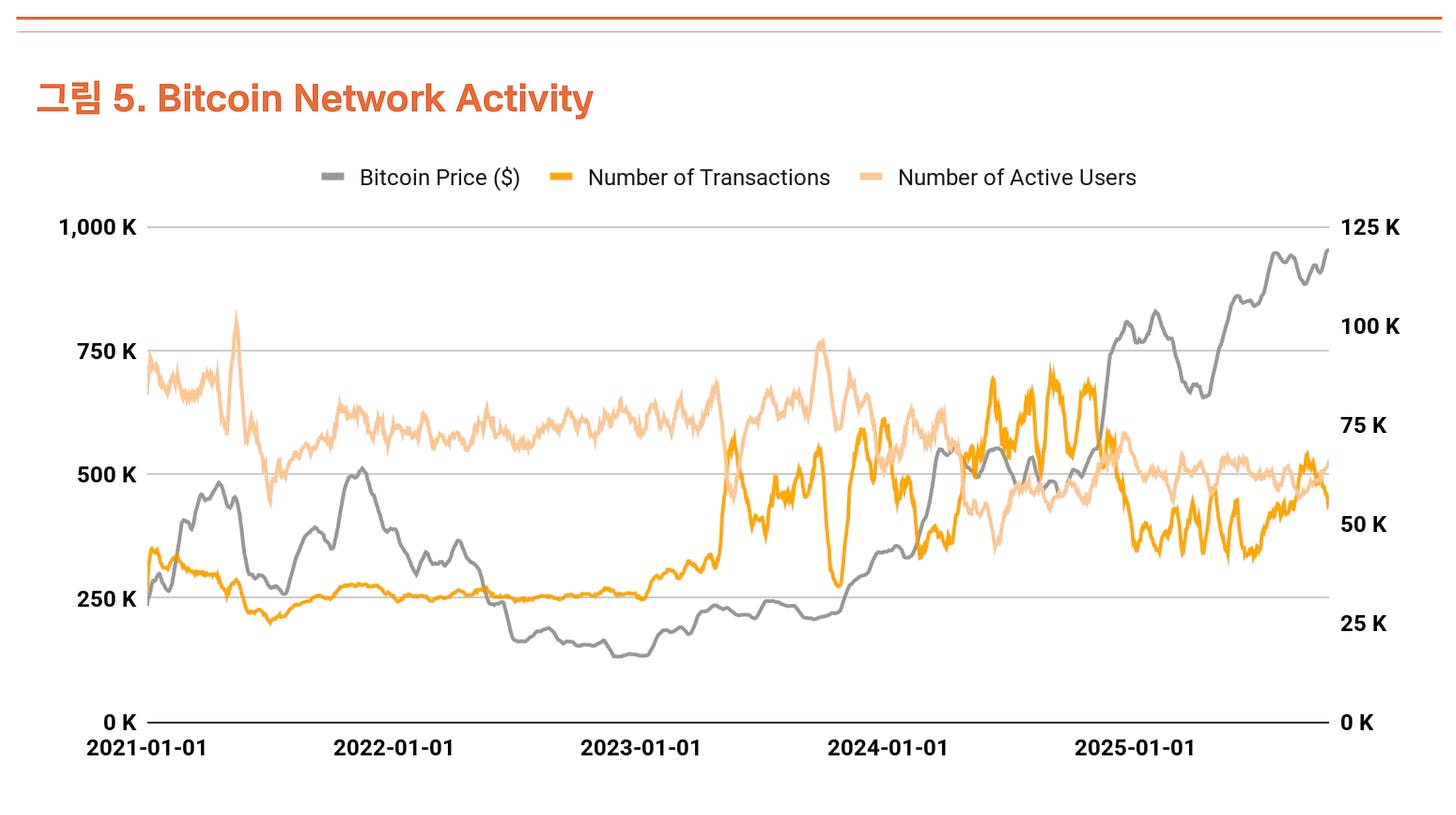 비트코인의 거래 건수와 활성 사용자 수는 전분기와 비슷한 수준을 유지하며 네트워크의 성장 모멘텀이 잠시 둔화된 모습이다(그림 5). 반면 총 거래 규모는 상승세로 전환되었다. 거래 건수가 줄어든 반면 거래 규모가 증가했다는 점은 적은 수의 거래로 더 큰 금액이 이동하고 있음을 의미하며, 이는 대규모 자금 이동이 늘어나고 있음을 시사한다.
