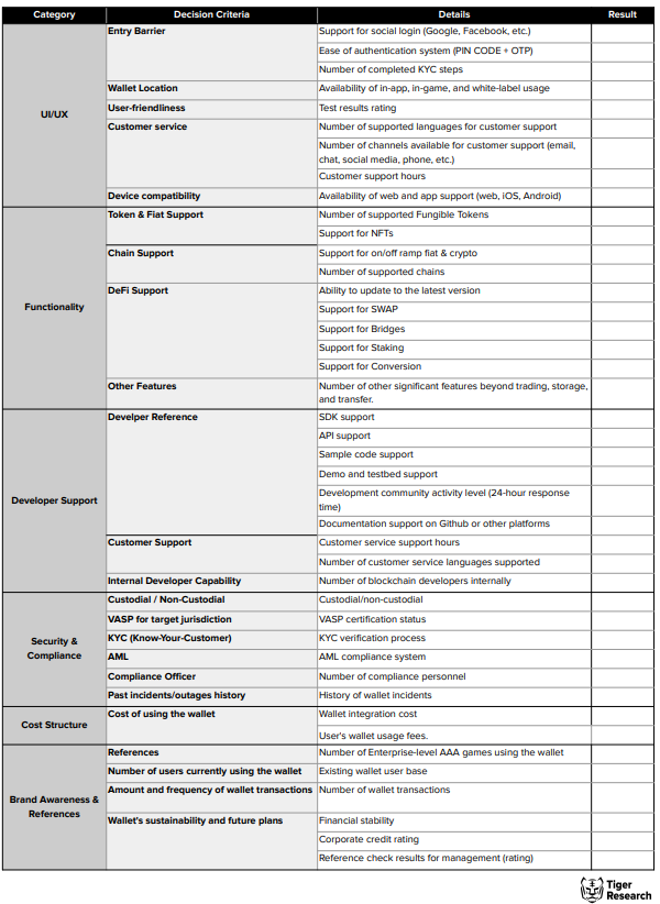 As outlined in the previous article, game companies should identify the most important criteria for selecting a blockchain wallet based on their game's characteristics and assign different weights to each criterion for a proper evaluation. Without accurately assessing their game's status, game companies may set incorrect weights and select an inappropriate blockchain wallet. Therefore, it is essential for game companies to have a clear understanding of their game's objectives, resource allocation, and current status before utilizing the decision criteria.