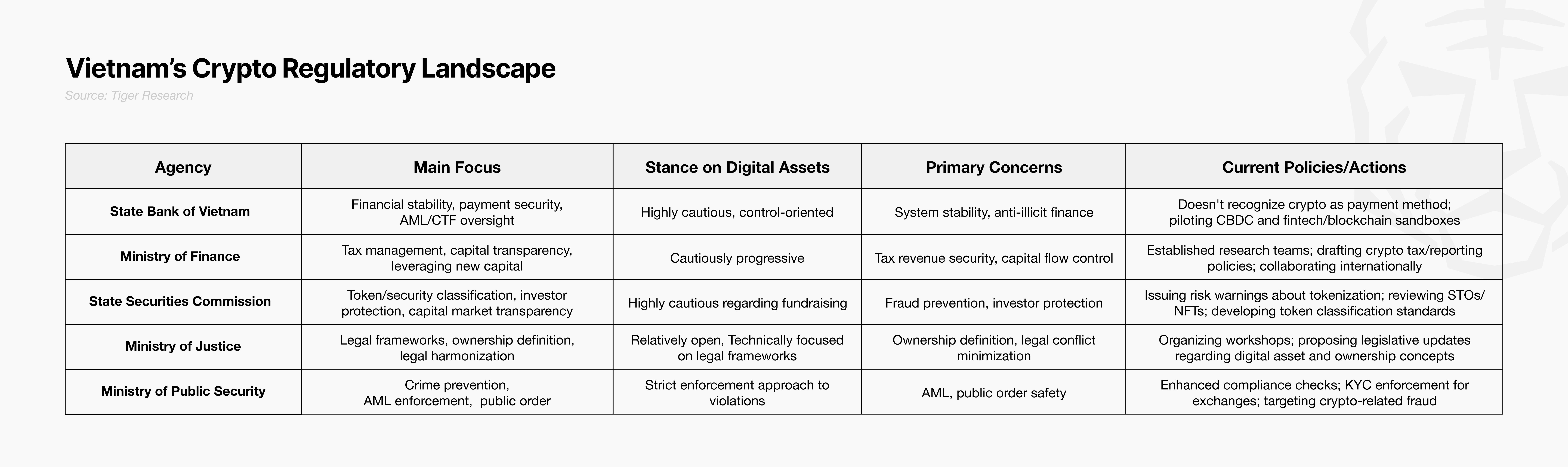 베트남의 규제 환경은 여러 규제 기관이 각자의 이해관계와 우선순위에 따라 다른 입장을 보인다. 따라서 베트남 암호화폐 산업을 이해하기 위해서는 각 규제기관의 역할과 입장을 명확히 파악하는 것이 중요하다.