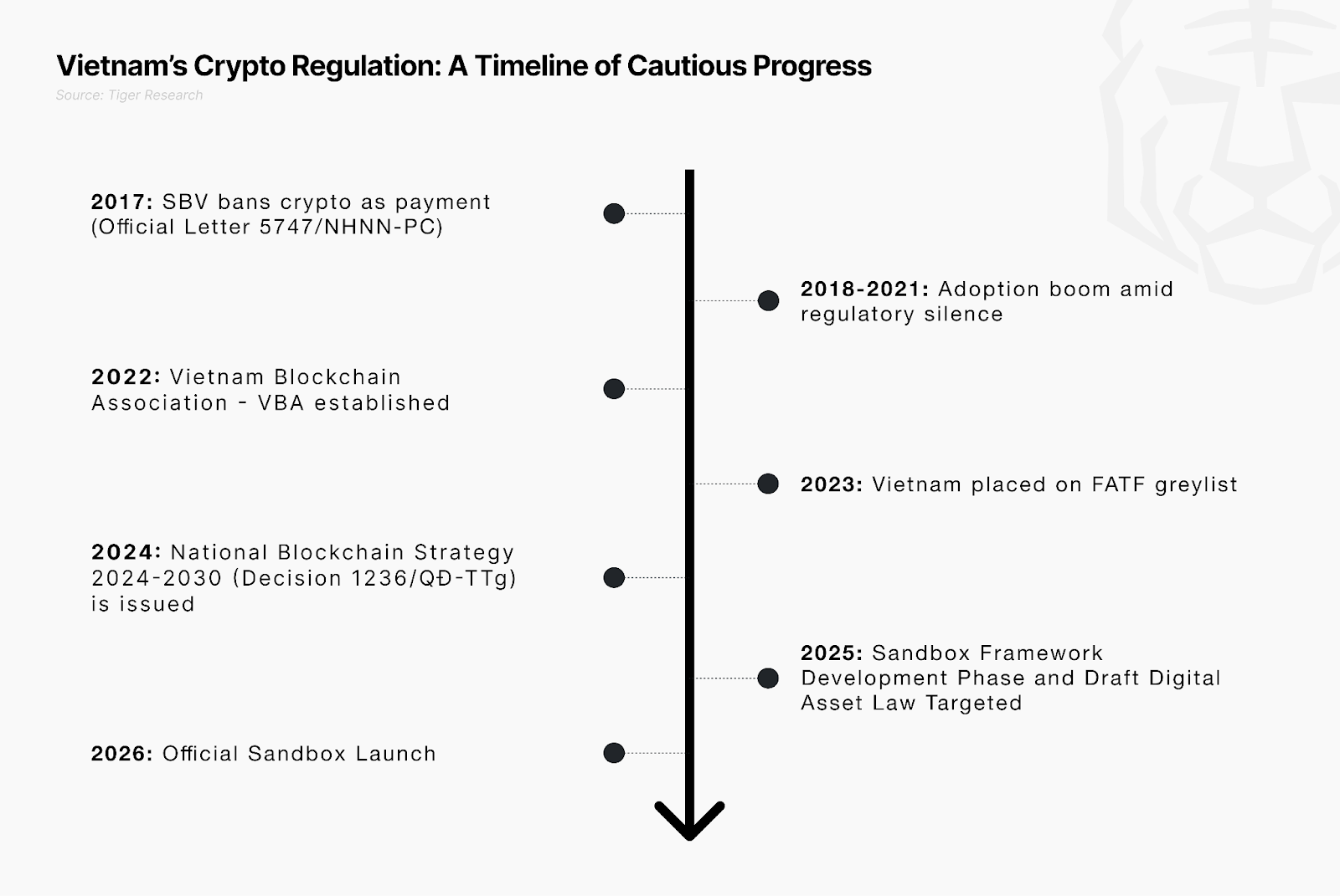 본 보고서는 타이거리서치가 작성했으며, 베트남의 암호화폐 규제가 회색 지대에서 구조화된 실험으로 전환되는 과정과 2026년 중반 샌드박스 출범이 기업에 미치는 영향을 분석합니다.