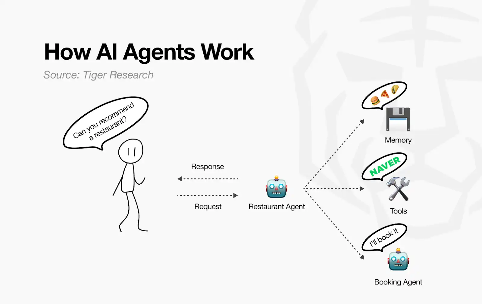 예를 들어, 사용자가 저녁 식사를 위해 레스토랑 예약이 필요하다고 가정하자. 기존의 생성형 AI 모델은 “서울에 분위기 좋은 한식집 추천해줘”와 같은 질문에 답변은 할 수 있다. 하지만 예약 가능 여부를 확인하거나 예약을 도와줄 수는 없다. 에이전트는 다르다. 에이전트는 사용자의 선호(위치, 종류, 시간대 등)를 고려해 인기 식당을 탐색하고 실시간 예약까지 도와줄 수 있다.
