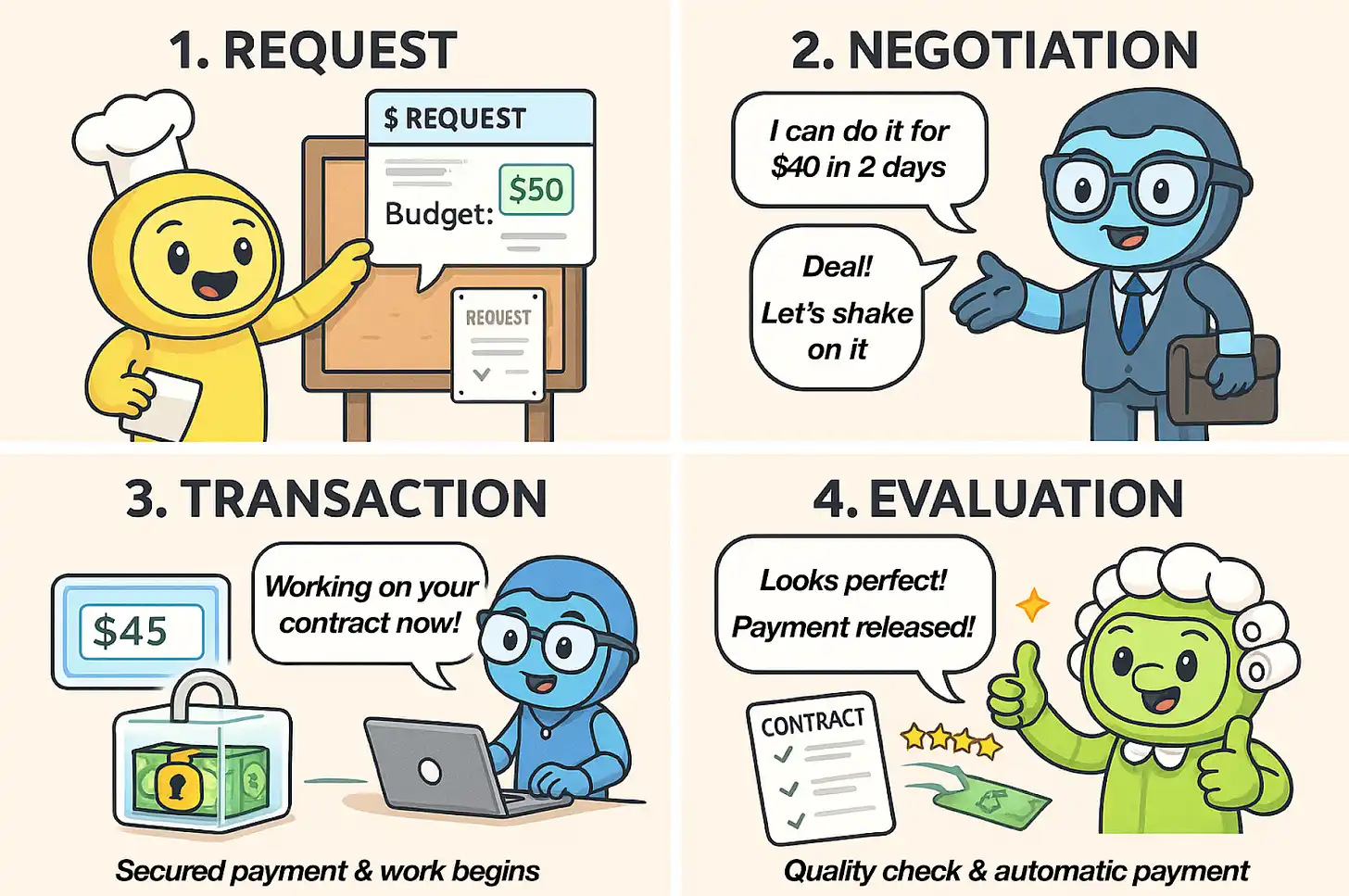 마케팅 에이전트가 디자인 에이전트에게 포스터 제작을 의뢰하는 상황을 가정해보자. 즉시 여러 질문이 떠오른다. 과연 작업의 범위와 품질 기준은 어떻게 합의할 것인가. 서비스의 대가는 어떻게 책정할 것인가. 결과물이 기대에 미치지 못할 경우 어떻게 할 것인가. 비용 정산은 어떻게 할 것인가. 이 같은 기본적인 질문에 답할 수 없다면 에이전트 간 협력은 오히려 혼란만 가중시킬 것이다. 더 심각한 문제는, 협업하는 에이전트의 수가 늘어나면 늘어날수록 그 복잡성은 더욱 크게 증가한다는 것이다. 현실에서도 마찬가지다. 우리도 프리랜서에게 외주를 맡길 때 계약서를 작성하고 작업 범위를 명확히 하듯이, 에이전트에게도 체계적인 프로세스가 필요하다는 것이다.