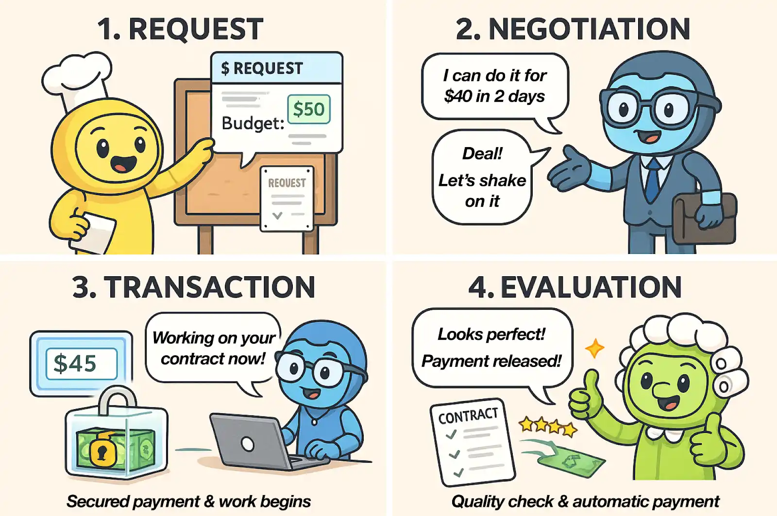 Hãy hình dung một tình huống: một agent marketing cần nhờ một agent thiết kế tạo poster. Ngay lập tức xuất hiện nhiều câu hỏi: Làm sao họ thống nhất được phạm vi công việc và tiêu chuẩn chất lượng? Làm sao định giá dịch vụ? Nếu sản phẩm đầu ra không đạt yêu cầu thì xử lý thế nào? Thanh toán sẽ diễn ra ra sao? Nếu không có câu trả lời cho những câu hỏi cơ bản này, việc hợp tác giữa các agent chỉ khiến mọi thứ thêm rối rắm. Và vấn đề nghiêm trọng hơn là độ phức tạp – nó tăng lên nhanh chóng khi số lượng agent phối hợp ngày càng nhiều. Điều này cũng phản ánh thực tế ngoài đời. Khi con người thuê freelancer, họ cần có hợp đồng rõ ràng, xác định phạm vi công việc, thời hạn và tiêu chuẩn. Các agent cũng cần những quy trình hệ thống tương tự.