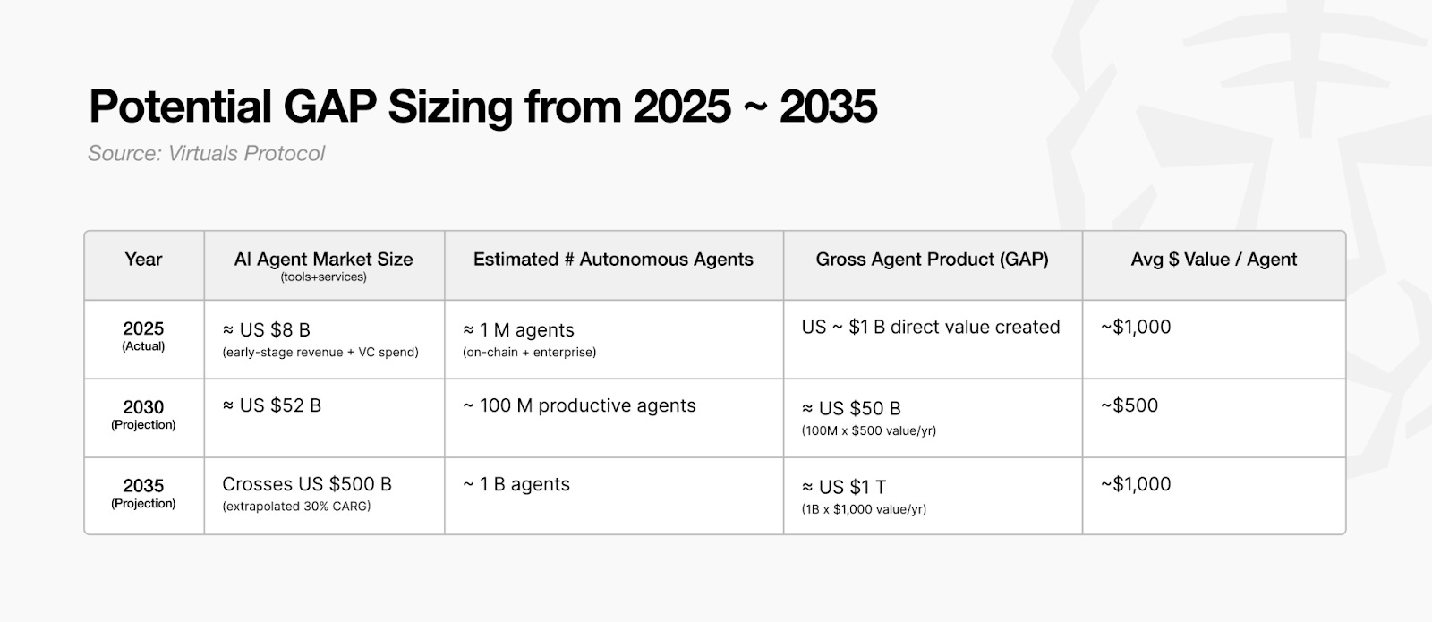 Tính đến năm 2025, có khoảng 1 triệu agent công khai đang hoạt động on-chain. Trung bình, mỗi agent tạo ra giá trị ~1.000 USD mỗi năm, tương đương tổng giá trị kinh tế là khoảng 1 tỷ USD. Con số này được gọi là GAP – Gross Agent Product. Nếu xu hướng này tiếp tục, quy mô nền kinh tế agent được dự đoán sẽ đạt 1 nghìn tỷ USD vào năm 2035.