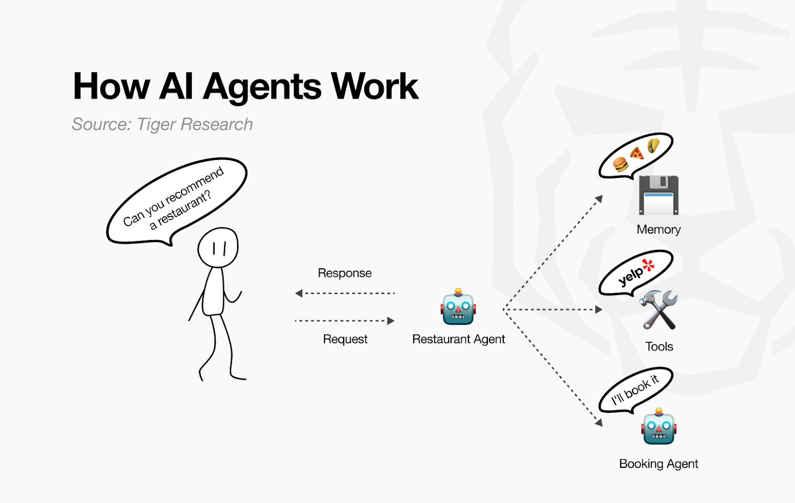 Ví dụ, giả sử người dùng muốn đặt chỗ ăn tối. Các mô hình AI hiện tại có thể trả lời câu hỏi như: “Gợi ý nhà hàng Hàn Quốc có không gian đẹp ở Seoul.” Nhưng chúng không thể kiểm tra tình trạng đặt chỗ hay hỗ trợ đặt bàn. Agent thì khác. Chúng xem xét sở thích người dùng (vị trí, loại nhà hàng, khung giờ), tìm kiếm các nhà hàng phổ biến, và thậm chí hỗ trợ đặt chỗ theo thời gian thực.