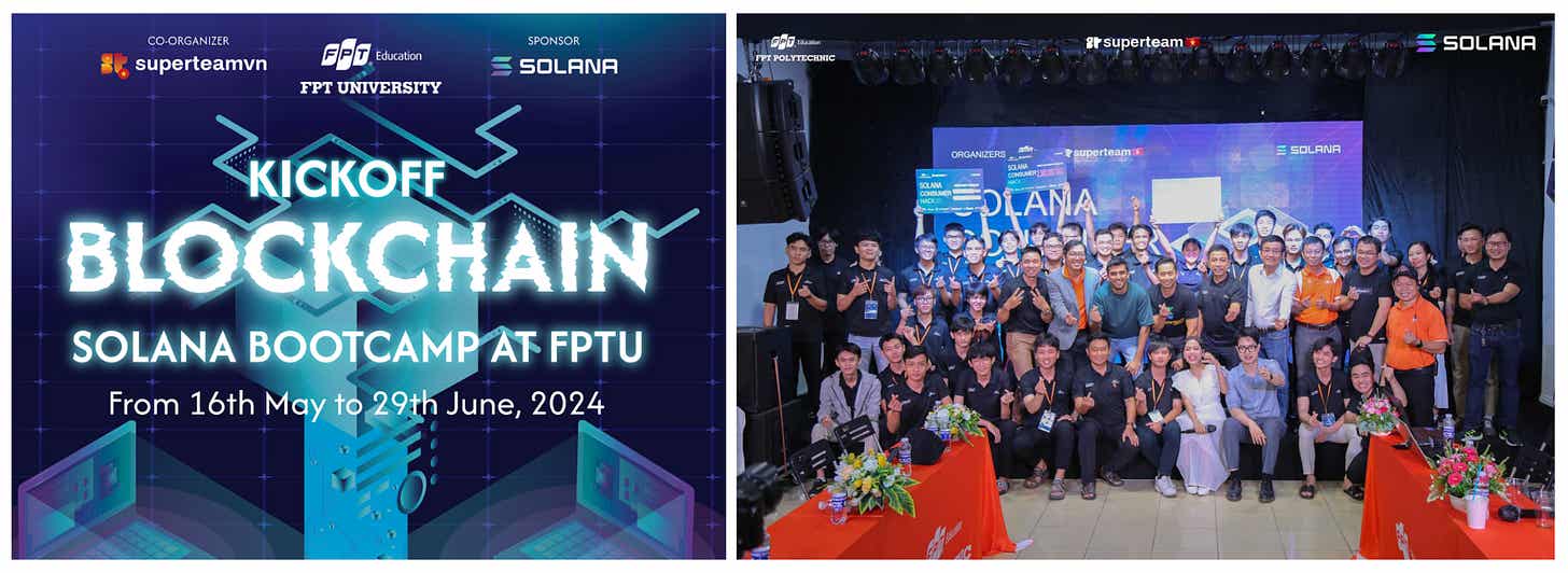 이 외에도, 솔라나는 베트남 FPT 대학교와 협력하여 솔라나 부트캠프를 개최했다. 이 부트캠프는 대학과 산업 간의 협력을 통해 진행된 사례로, 학생들에게 최신 블록체인 교육을 제공하며, 베트남의 웹3 교육 환경에 독특성을 형성하기도 한다.