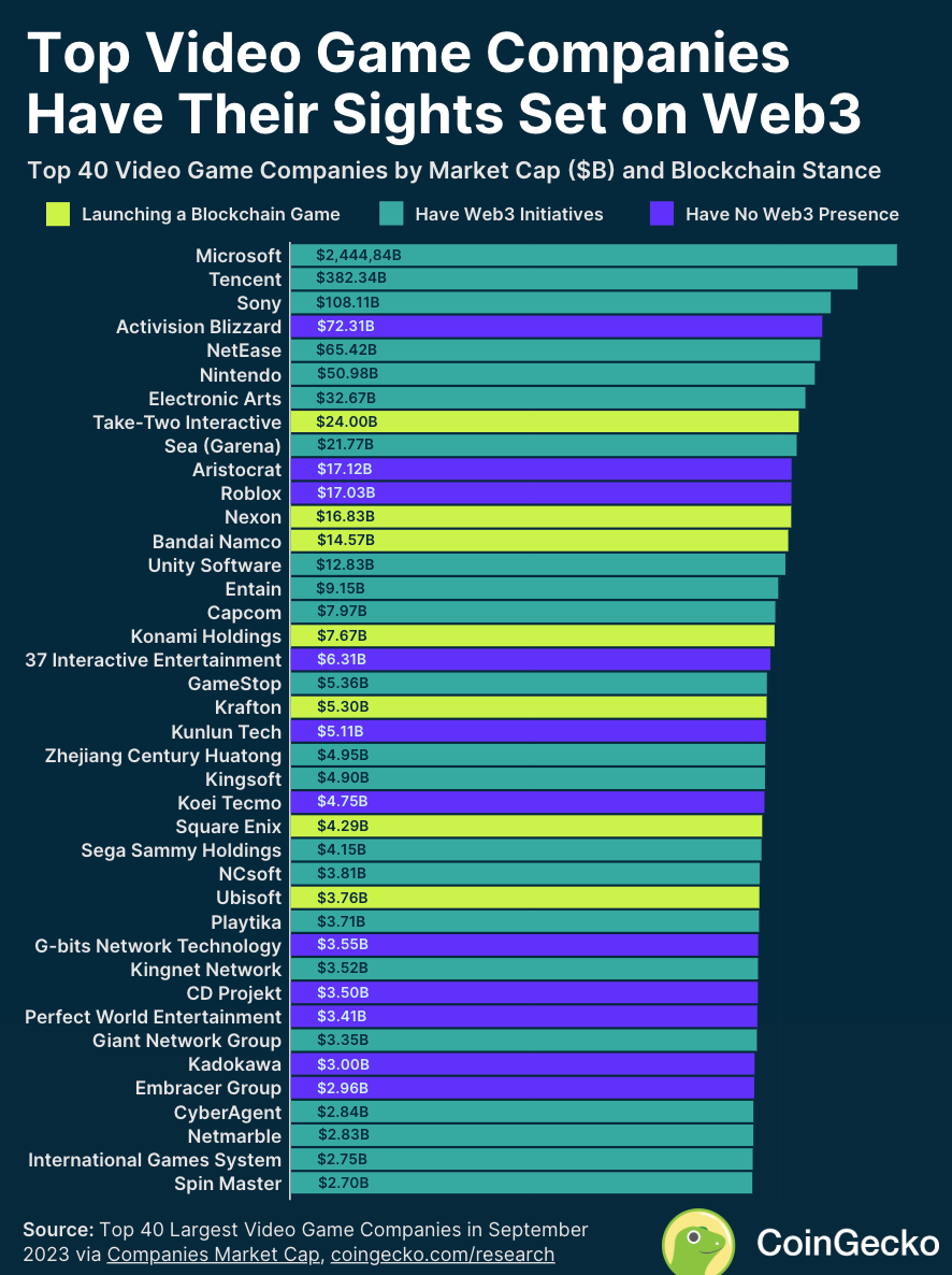 게임 시장의 성장 한계를 극복하기 위해 2023년 기준 게임 산업 상위 40개 기업 중 29개사가 웹3 사업에 뛰어들었으며, 넥슨과 크래프톤 등이 적극적으로 시장에 진출하고 있다.