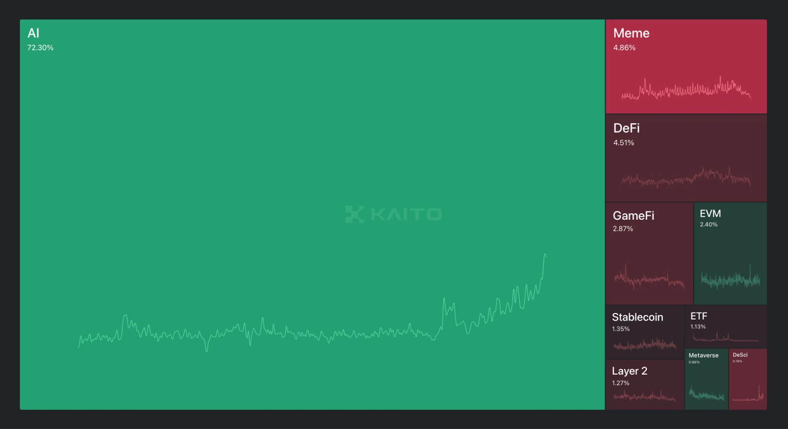 현재 암호화폐 시장은 AI 관련 프로젝트가 70% 이상의 관심을 독차지하고 있으며, 게임 섹터는 한 자릿수 점유율로 큰 차이를 두고 뒤를 잇고 있다. 이러한 쏠림 현상으로 인해 지금까지 주목할 만한 성과를 보여준 웹3 게임 산업의 혁신성과 성장 가능성이 제대로 평가받지 못하고 있다.