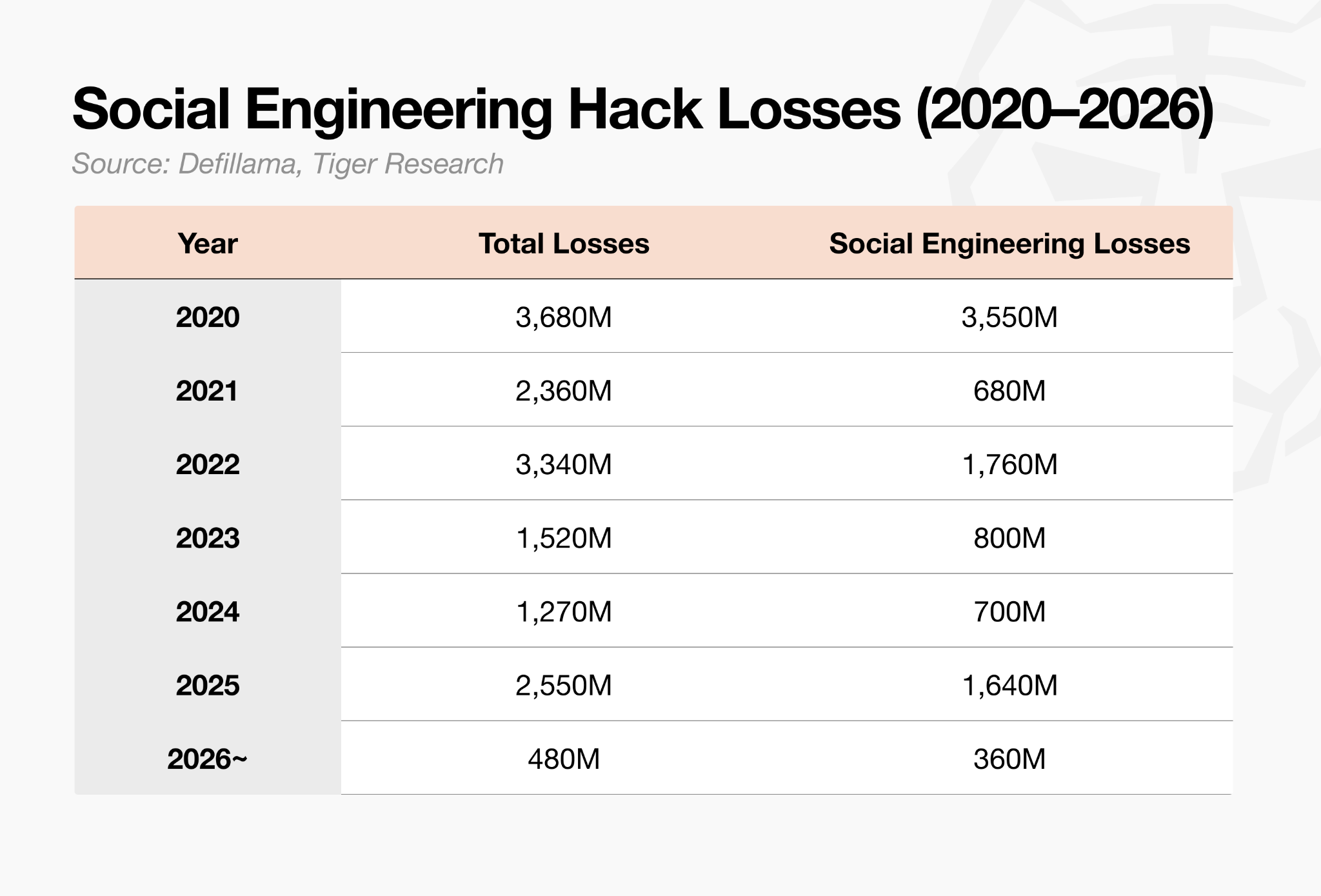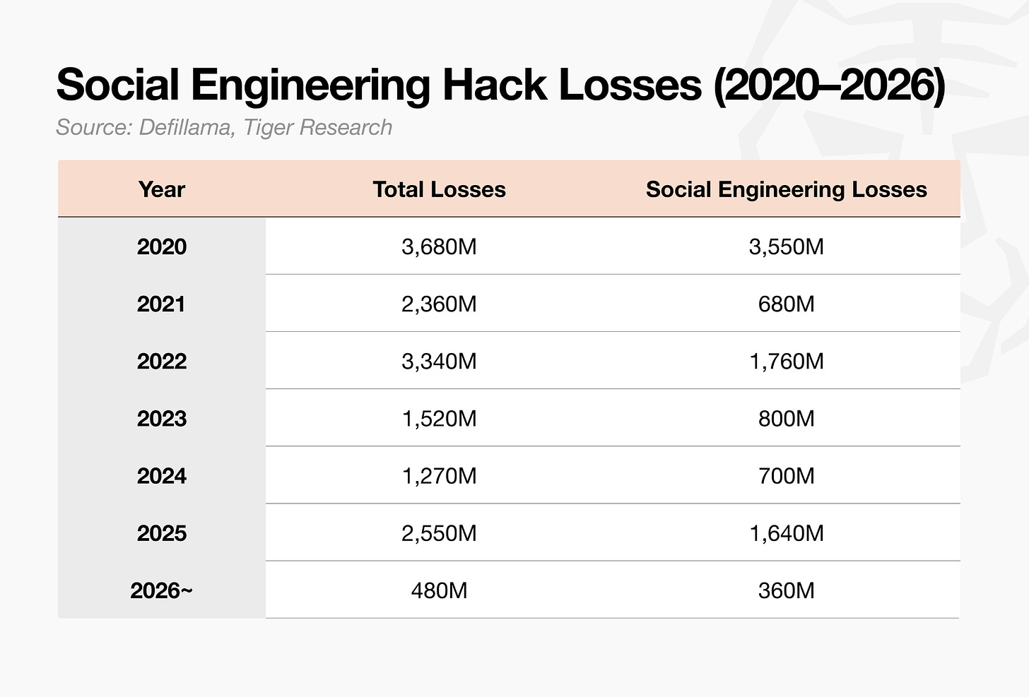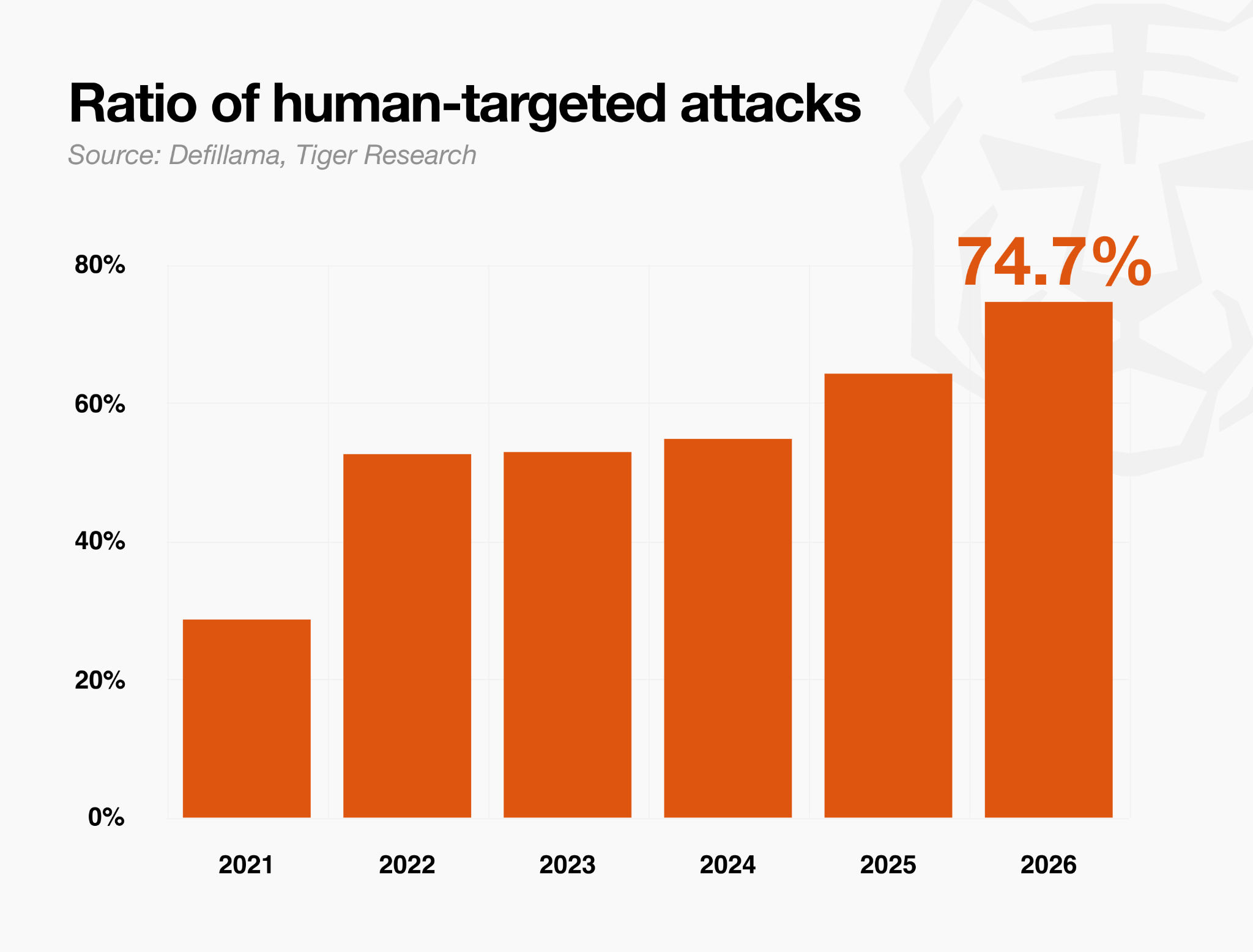 Social engineering accounted for 28.7% of total hack losses in 2021, rising to 64.3% in 2025 and 74.7% in Q1 2026. Attacks targeting people continue to expand, while code-level exploits have declined in relative share over the same period.
