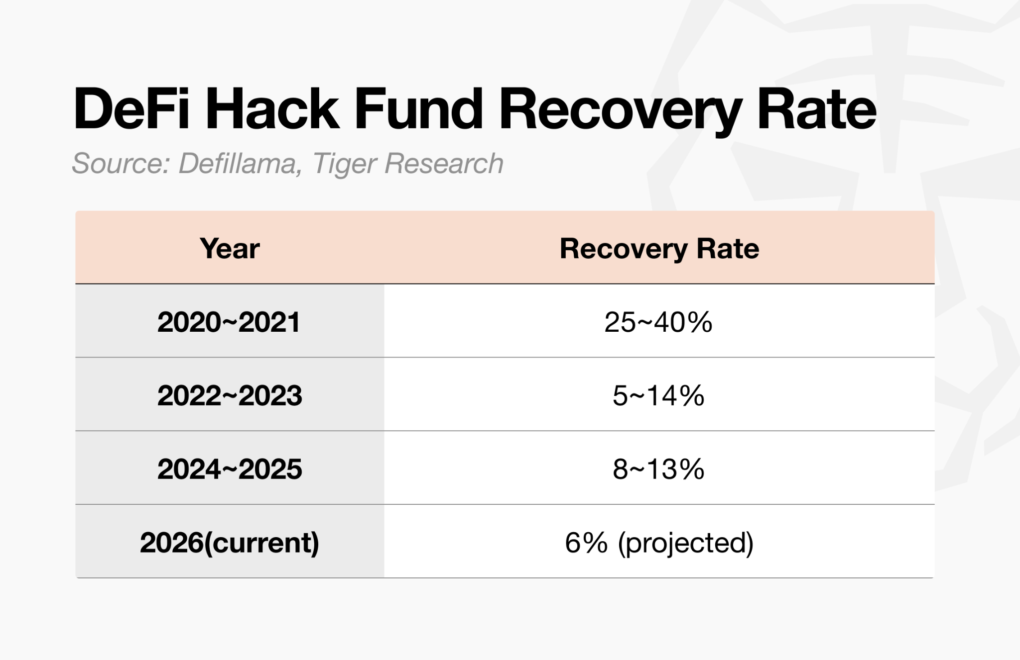 Since 2020, the average recovery rate for stolen funds has stayed below 10%. Unlike traditional finance, Web3 allows direct on-chain theft, so funds exit the moment a breach occurs.