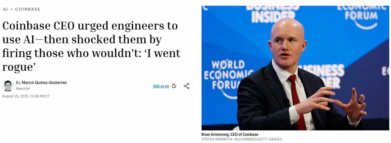 The intensity of that urgency is visible in Coinbase CEO Brian Armstrong’s actions. He issued a company-wide mandate for all engineers to onboard AI coding tools within one week and fired employees who did not comply.