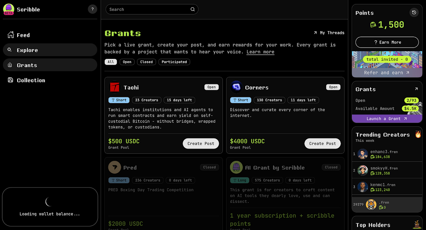Scribble is a representative example. Projects post grants in the form of bounties, and KOLs create and submit content for review before receiving rewards. This is a submit-and-review model rather than real-time tracking.
