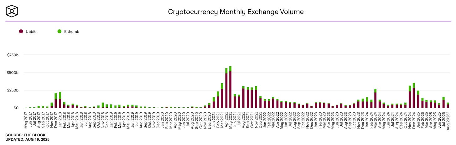 Korea occupies a unique position in the global crypto market. Korean won (KRW) trading volume ranks second globally after the US dollar (USD) among fiat currencies, sometimes even surpassing the dollar. No other single country generates such trading volumes. This market environment enabled Upbit and Bithumb to grow into large corporations (designated as large corporations in Korea for companies with assets over 5 trillion won).