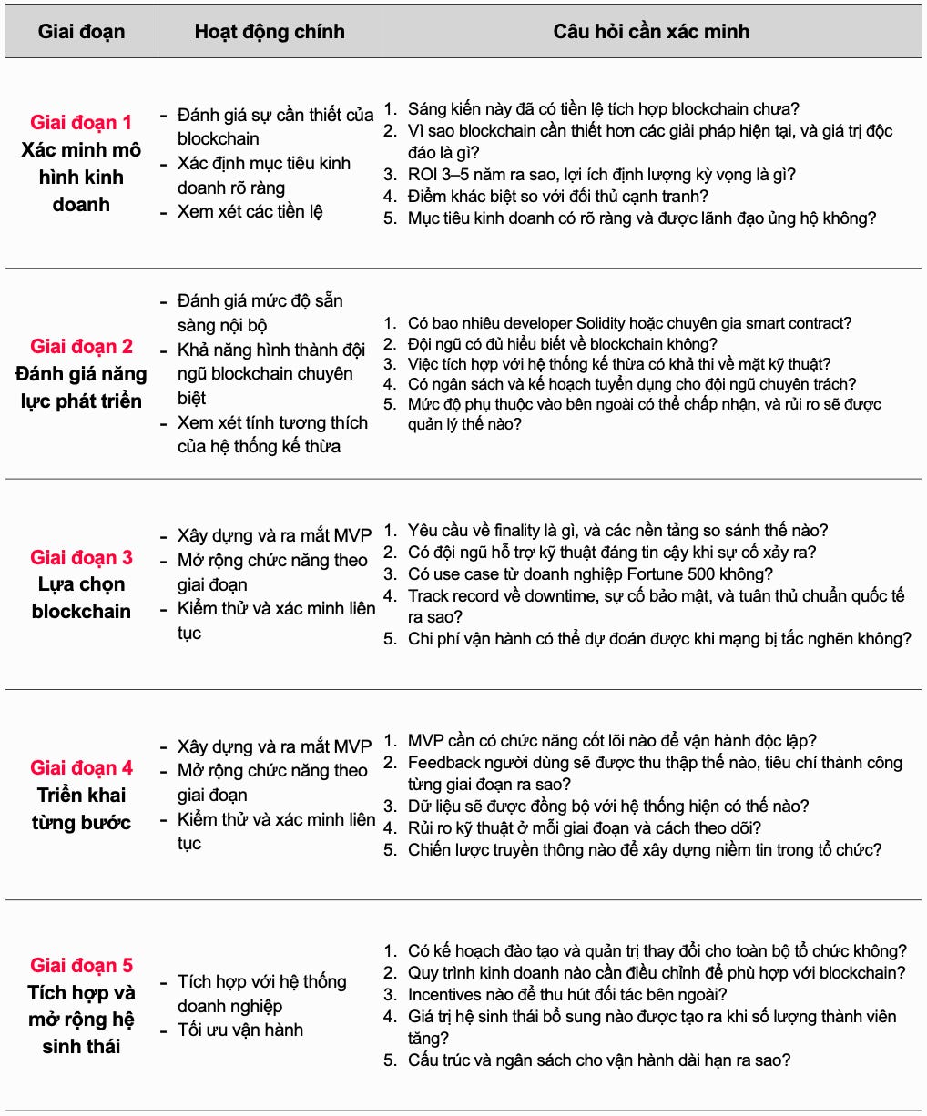 Bảng trên thể hiện một framework có cấu trúc để áp dụng blockchain cho tổ chức, được xây dựng dựa trên kinh nghiệm tư vấn thực tế. Mục tiêu của framework 5 bước này là giảm thiểu rủi ro bằng cách xác minh từng giai đoạn một cách có hệ thống.